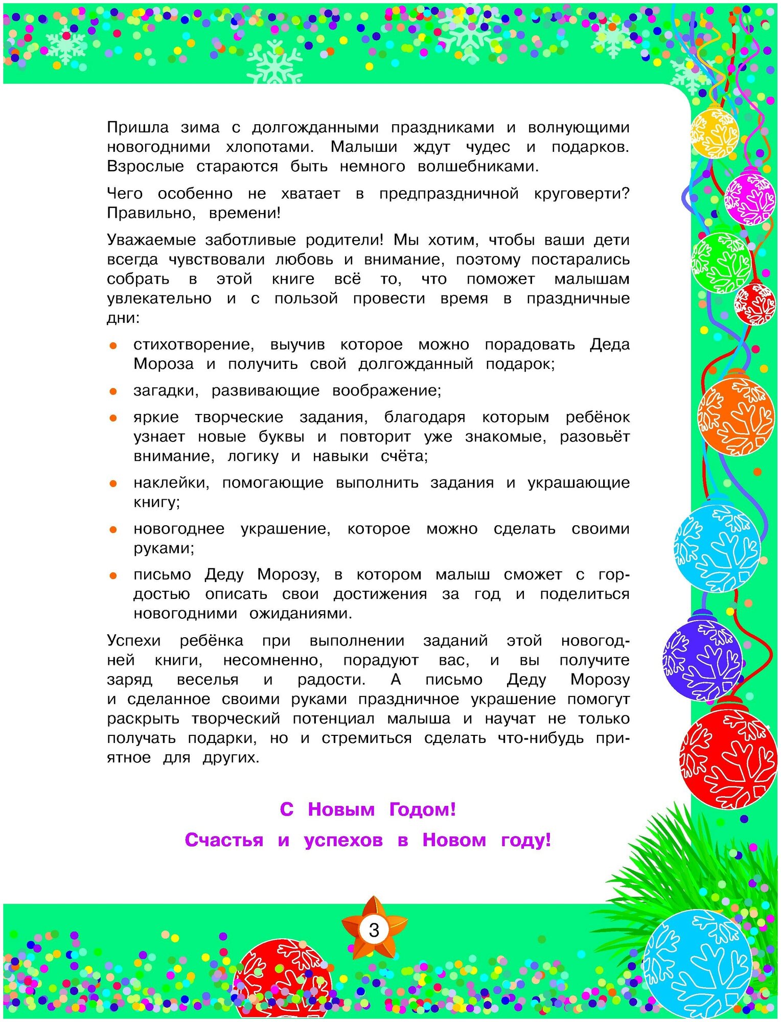 Сюжетные рисунки для раскрашивания, новогодние стихотворения, увлекательные задания с наклейками, веселые лабиринты, творческие поделки помогут ребенку интересно и с пользой провести время. Занимательные игровые задания позволят маленькому почемучке расширить кругозор, раскрыть множество своих талантов, развить логику, внимание, память, воображение, навыки счета и мелкую моторику. В середине книги вас ждет приятный сюрприз — картонная вкладка-поделка. Сделанное своими руками праздничное украшение научит ребенка не только получать подарки, но и стремиться сделать своими руками что-нибудь приятное для других. Адресовано мудрым родителям и активным любознательным малышам.