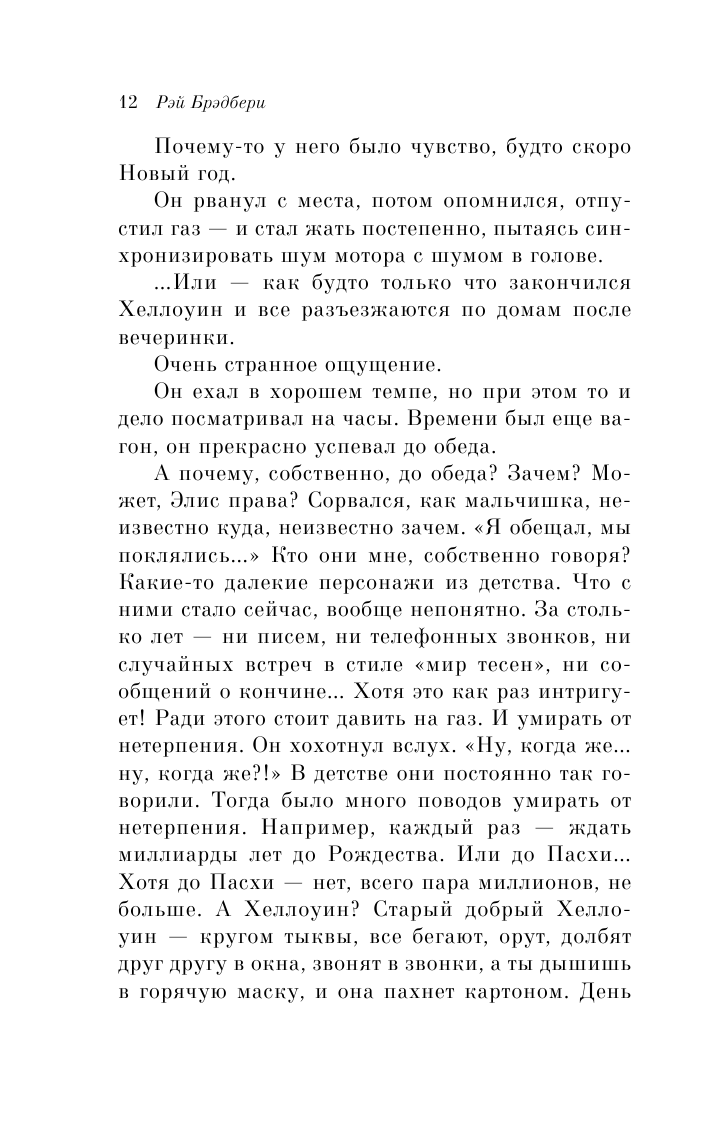 Формат книги предполагает дорожные путешествия вместе с ней. Мне кажется, она идеальна для поезда, где ты читаешь один рассказ, немного отходишь от него за поеданием чего-то, а потом приступаешь к новому, и так до конца книги. Любая поездка со сборником рассказов Брэдбери превращается из скучной потери времени в настоящее путешествие в судьбы литературных героев и в свои собственные эмоции и размышления.