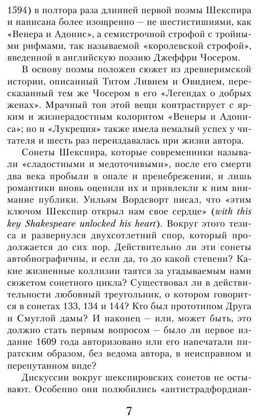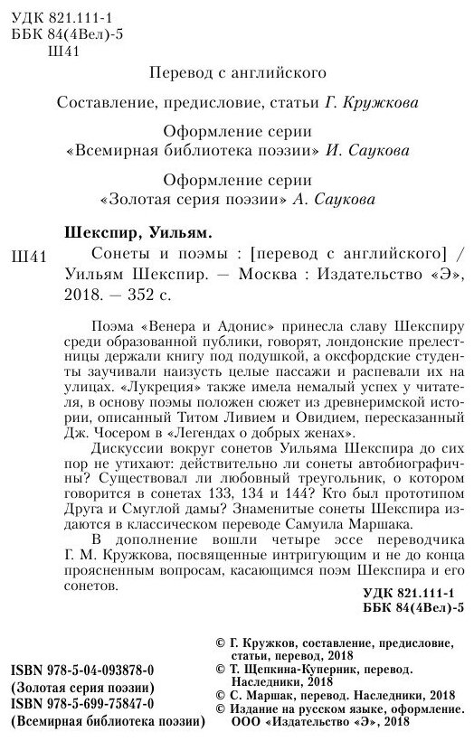 Поэма «Венера и Адонис» принесла славу Шекспиру среди образованной публики, говорят, лондонские прелестницы держали книгу под подушкой, а оксфордские студенты заучивали наизусть целые пассажи и распевали их на улицах. «Лукреция» также имела немалый успех у читателя, в основу поэмы положен сюжет из древнеримской истории, описанный Титом Ливием и Овидием, пересказанный Дж. Чосером в «Легендах о добрых женах». Дискуссии вокруг сонетов Уильяма Шекспира до сих пор не утихают: действительно ли сонеты автобиографичны? Существовал ли любовный треугольник, о котором говорится в сонетах 133, 134 и 144? Кто был прототипом Друга и Смуглой дамы? Знаменитые сонеты Шекспира издаются в классическом переводе Самуила Маршака. В дополнение вошли четыре эссе переводчика Г.М. Кружкова, посвященные интригующим и не до конца проясненным вопросам, касающимся поэм Шекспира и его сонетов.