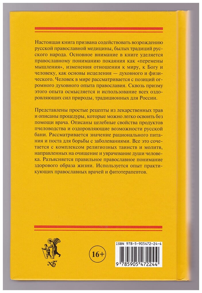 Основное внимание в книге уделяется православному пониманию покаяния как изменения отношения к миру, к Богу и человеку, как основы исцеления — духовного и физического. Осмысляется использование всех оздоровляющих сил природы, традиционных для России. Представлены простые рецепты из лекарственных трав и описаны процедуры, которые можно легко освоить без помощи врача. Описаны целебные свойства продуктов пчеловодства и оздоровляющие возможности русской бани. Рассматривается значение рационального питания и поста для борьбы с заболеваниями. Все это сочетается с комплексом религиозных таинств и молитв, направленных на очищение и уврачевание души человека.