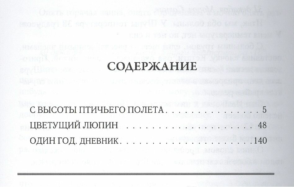 Действие трех повестей, представленных в книге Н. Брагиной, разворачивается в строго ограниченном временном и даже пространственном измерении. В повести «С высоты птичьего полета» - это детство автора, ограниченное пространством ее двора и родительского дома. В повести «Цветущий люпин» - это дачное лето, ограниченное временем «лихих 90-х». А в повести «Один год» композиция задается метеорологическими сменами погоды, которые сопровождаются столь же непредсказуемой, как и погода, сменой обстоятельств, характеров, событий. Такой «классицизм» авторских приемов позволяет наилучшим образом, обращаясь к воспоминаниям и отступлениям, преодолеть рамки времени.