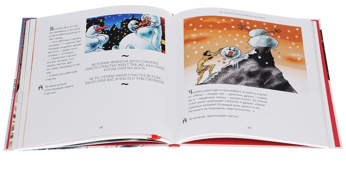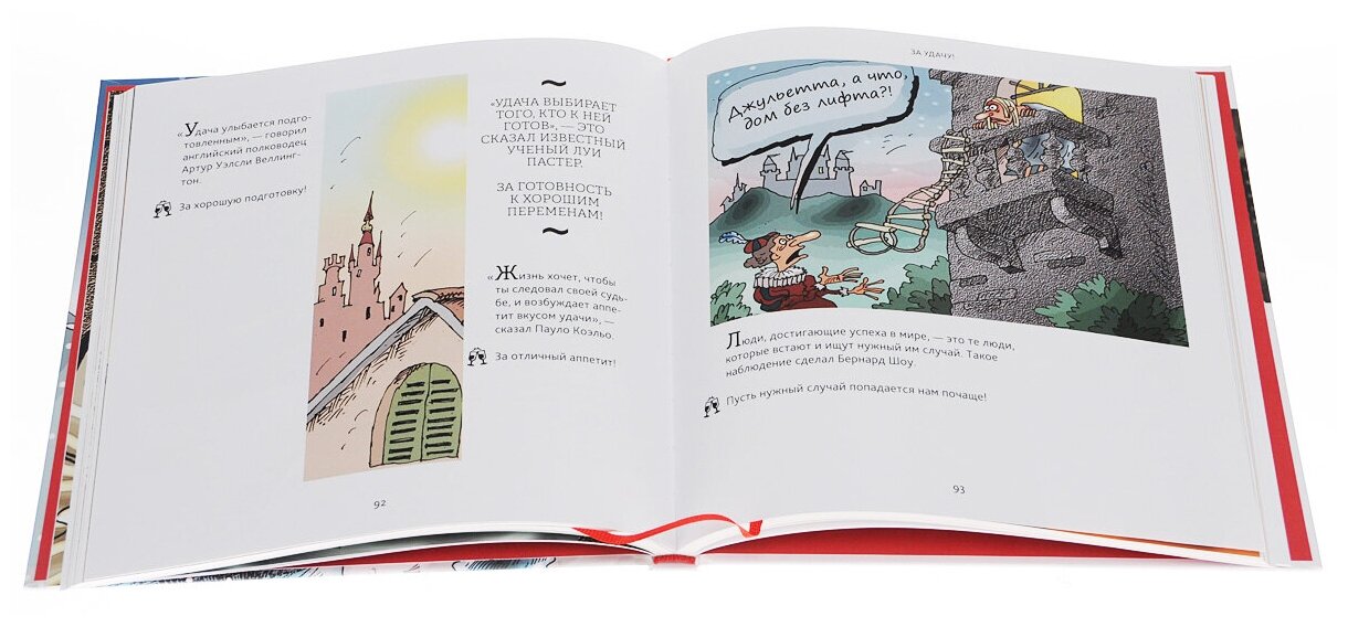 Эта книга - собрание нетривиальных, ''незатасканных'' тостов на все случаи жизни. Тосты часто основаны не только на высказываниях часто цитируемых Конфуция, Рокфеллера, Твена, но и на словах Стива Джобса, ставшего уже кладезью афоризмов, Эльчина Сафарли, Майкла Фассбендера и многих других. Чтение довольно занимательное само по себе, так что это не просто ''прикладная'' книга, в которой ищешь подходящие тосты перед приемом гостей. Очень удобно, что предусмотрено ляссе.
