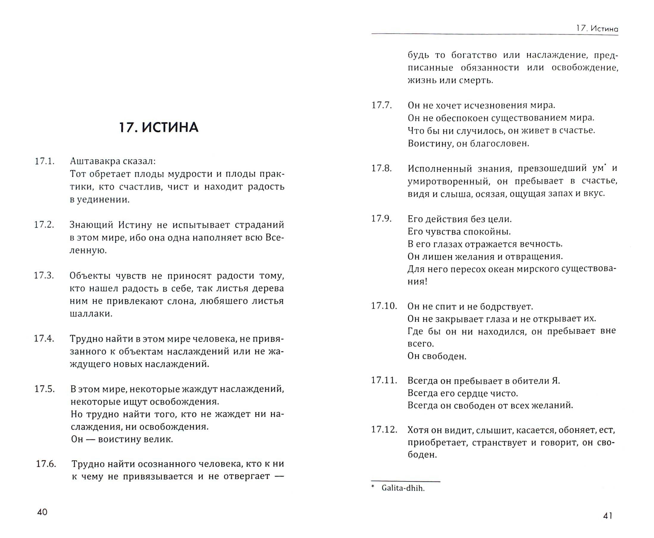 "Есть один древний трактат на санскрите, который некоторые ученые считают старше Бхагавад Гиты. Он называется Аштавакра Гита и содержит диалог между мудрецом Аштавакрой и его учеником, царем Джанакой. ЭТОТ ДИАЛОГ ДАЕТ ПОТРЯСАЮЩИЙ ОБРАЗЕЦ БОЖЕСТВЕННОГО ЭЛЕМЕНТА, ПРИСУТСТВУЮЩЕГО В ОТНОШЕНИЯХ МЕЖДУ РЕАЛИЗОВАННЫМ ГУРУ И В ВЫСШЕЙ СТЕПЕНИ "СОЗРЕВШИМ" УЧЕНИКОМ, то есть тем, кто ждет лишь той единственной мгновенной искры в виде интуитивного проникновения в Истину, которая дает внезапное просветление. В то же время Аштавакра Гита дает поразительно прямую, позитивную и четкую экзегезу (толкование) доктрины недуальности, возможно, лучшую, из всех когда-либо сделанных.