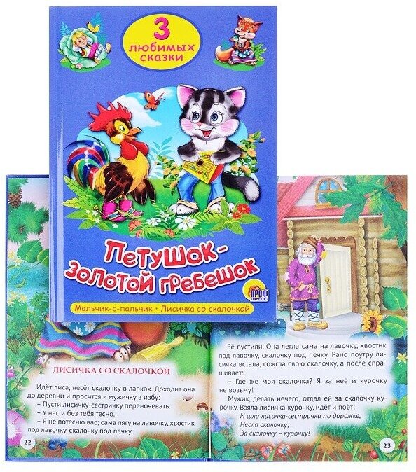 Книга недорогая и красочно иллюстрирована, такие рисунки, мне кажется, нравятся детям. Твердая гладкая обложка и бумажные страницы, 3 сказки: Петушок-Золотой Гребешок, Мальчик-с-пальчик и Лисичка со скалочкой. Смутило несоответствие рисунков в Мальчике-с-пальчик тексту. Бабушка отрубила себе мизинец, а замотан большой палец, мальчик огромный: то размером с кочан капусты, то умещается в ухе лошади и проглочен волком, то сидит на лошади и волке такой взрослый мальчик. В общем, это смущает. В сказке про лисичку опечатка: упомянута в одном месте гусочка вместо курочки. В остальном все нормально. Книга стоит своих денег :).