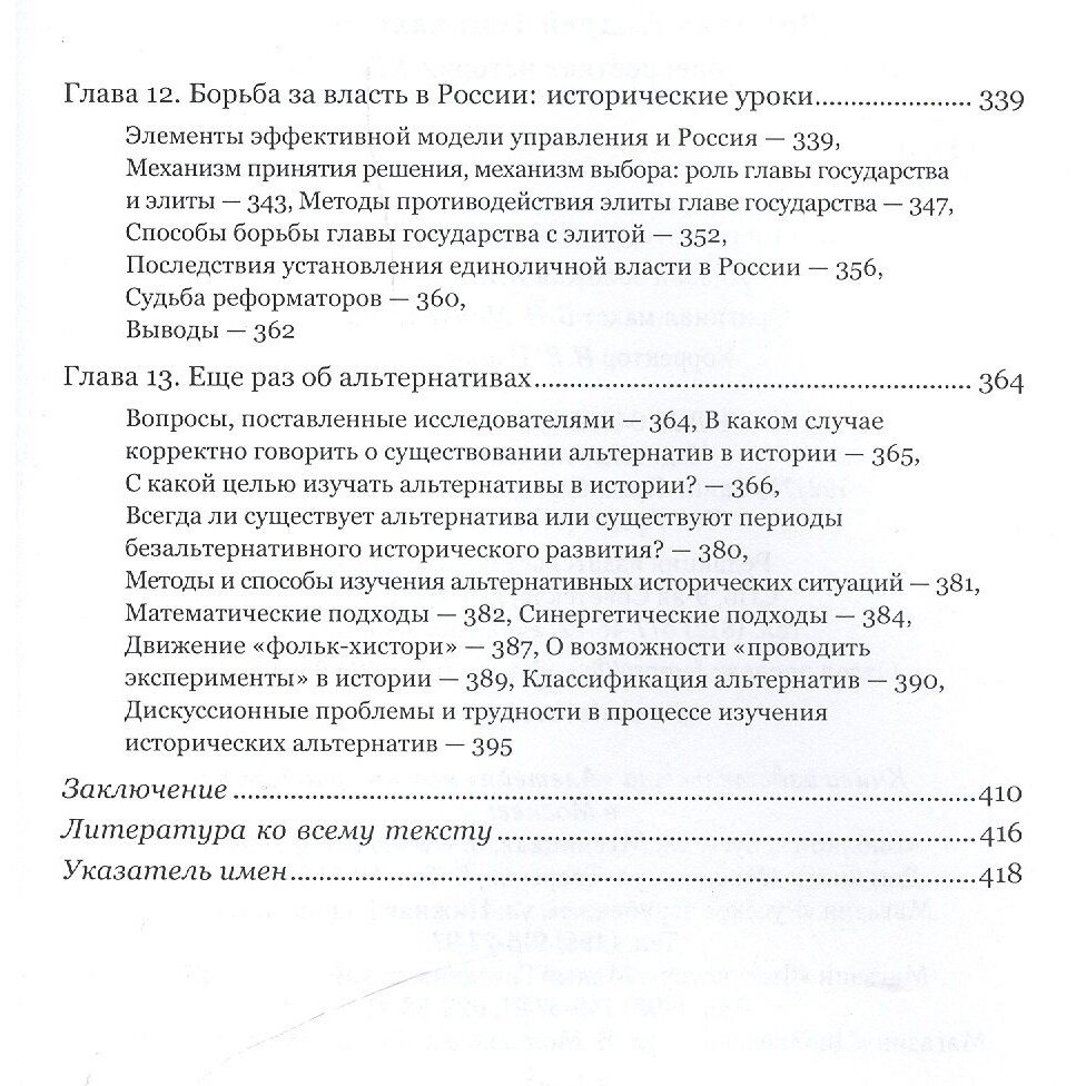 В этой книге предлагаются ответы на вопросы: Почему талантливый и трудолюбивый народ, имея богатейшие природные ресурсы, редко процветал? Почему на исторических перекрестках XIV-XIX вв. наша страна между свободой и несвободой, как правило, выбирала несвободу? Что дает изучение нереализовавшихся вариантов истории? Как отделить реальную альтернативу от ее иллюзии? Автор анализирует признаки эффективной и неэффективной систем управления; последствия установления единоличной власти в России; роль главы государства и элиты в выборе исторического пути; веками отработанные методы противодействия элиты главе государства и способы борьбы главы государства с элитой; роль личности в формировании альтернативы. Анализ данных проблем и сюжетов осуществляется на большом фактическом материале, включая события из личной жизни царей, императоров, политиков, полководцев, повлиявшие на судьбы России.