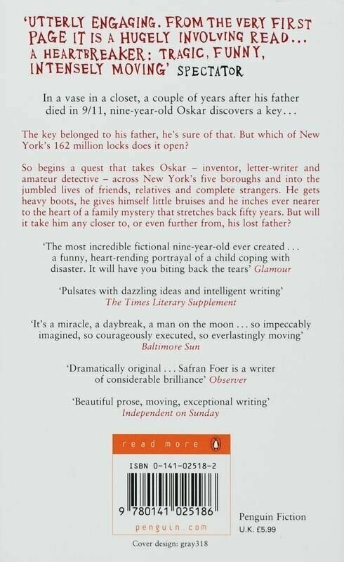 Nine-year-old Oskar Schell is an inventor, amateur entomologist, Francophile, letter writer, pacifist, natural historian, percussionist, romantic, Great Explorer, jeweller, detective, vegan, and collector of butterflies. When his father is killed in the September 11th attacks on the World Trade Centre, Oskar sets out to solve the mystery of a key he disovers in his father's closet. It is a search which leads him into the lives of strangers, through the five boroughs of New York, into history, to the bombings of Dresden and Hiroshima, and on an inward journey which brings him ever closer to some kind of peace.
