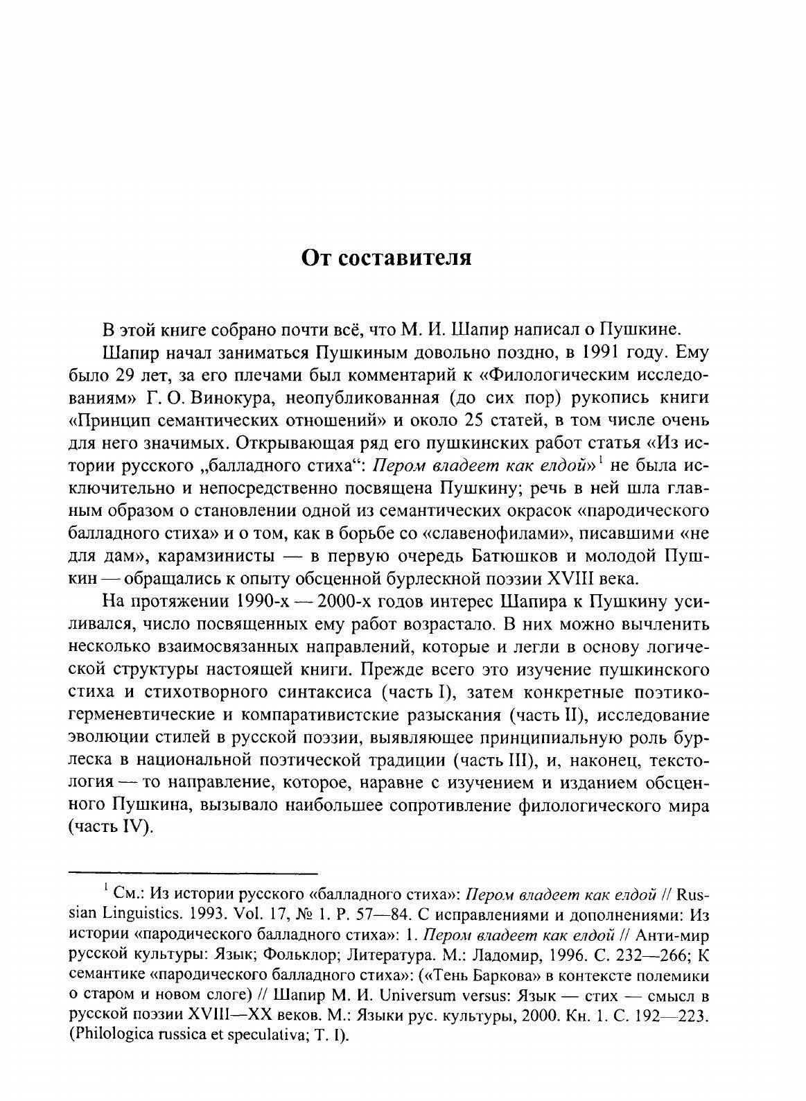 В книге собраны основные пушкиноведческие работы М.И.Шапира. Это статьи по истории и типологии пушкинского стиха и стихотворного синтаксиса, конкретные поэтико-герменевтические и компаративистские этюды, исследования по эволюции стилей в русской поэзии, выявляющие принципиальную роль бурлеска в национальной поэтической традиции от Ломоносова до Пушкина, а также разыскания в области пушкинской текстологии.