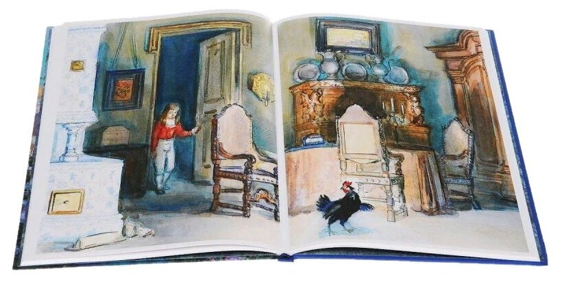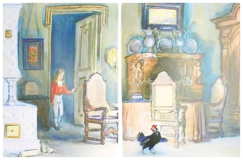 И выражение "Смени пластинку!" в нашей семьей было в ходу, причём в самом прямом смысле. Когда мама уже не могла раз за разом слушать скрипучее: "Алёша! Алёша!, то именно этой фразой просила меня поменять наконец сказку в проигрывателе. Несколько лет назад я купила где-то издание "Чёрной курицы" с иллюстрациями Михаила Бычкова. Но образы, которые изобразил художник настолько отличались от того, что рисовало в детстве моё воображение, что я так и не смогла сжиться с этим изданием. Да и ребёнку рисунки Бычкова кажутся страшноватыми. Так и лежит у нас эта книжка абсолютно новенькая, нечитанная, несчастненькая... А вот рисунки Рейпольского - как бальзам на душу! Вот он МОЙ Алёша, вот он МОЙ министр-Чёрная курица. Читала сыну сказку и наслаждалась каждой строчкой любимой сказки в таком чудесном оформлении. И сама сказка сына, к моей огромной радости, очень захватила. А ведь всегда по-особенному приятно, когда твои любимые книги и детям приходятся по сердцу...