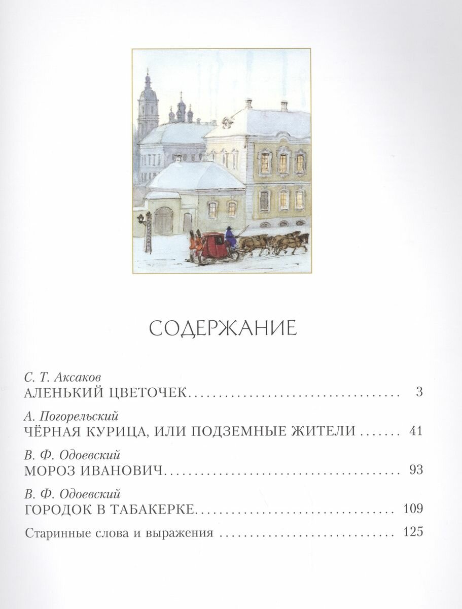 Под обложкой этого сборника собраны сказки и сказочные повести русских писателей ХIX века, прочно вошедшие в золотой фонд русской литературы для детей: "Аленький цветочек" С. Т. Аксакова, "Чёрная курица" А. Погорельского, "Городок в табакерке" и "Мороз Иванович" В. Ф. Одоевского.