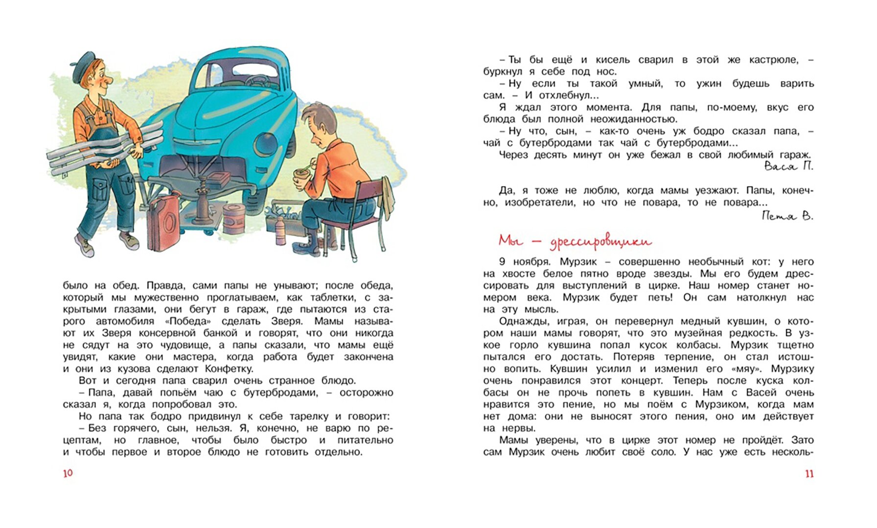 ну и когда само произведение нравится и взрослому, и ребенку. Потому что некоторые книги читаю я на ночь ребенку, а некоторые она сама. Дочка любит (и это есть в данном издании) красочные и даже забавные иллюстрации, большой формат книги, легкий слог, саму тему "школьники пишут дневник". Мы с подругами тоже писали совместный дневник в школе, поэтому навеяло приятные воспоминания. Точнее, тут пишет в основном Вася, "потому что у него пятерка по русскому", а Петя иногда встревает. Хорошая добрая и такая детская книжка.