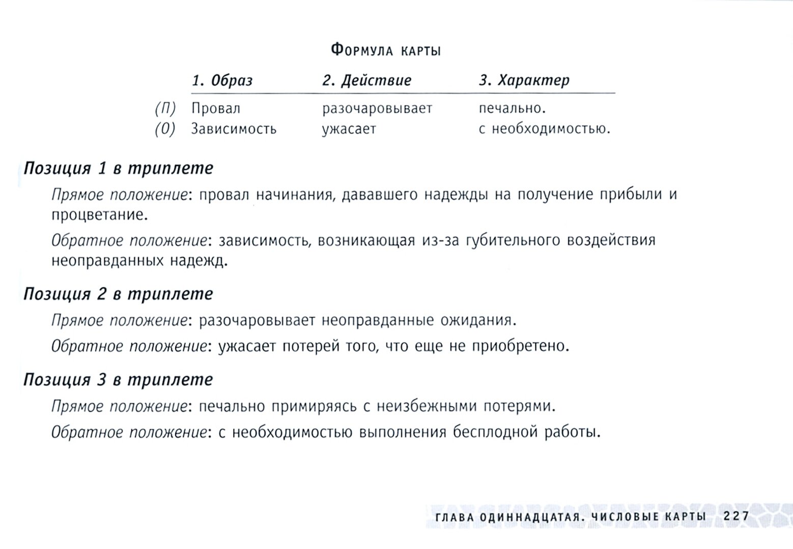 В качестве рабочей колоды автор взял Универсальное таро. Как признал сам автор, книга не содержит ничего сложного или сверхэзотеричного, никакой истории и теории Абсолютная правда. На мой взгляд, несколько плоское видение. Описания карт очень краткие, значения отражены набором ключевых слов Впрочем, изюминка книги не в этом. Изюминка в формуле. Основная идея автора триплет: образ, действие, характер действия. Простой триплет когда ответ считывается с одной карты. В зависимости от поставленного вопроса для ответа использовать нужную часть, без учета остального то есть, либо образ, либо действие, либо характер действия. Сложный триплет состоит из трех карт. Первую карта - образ, вторая - действие, третья - характер действия. В книге перечислены формулы триплетов на все 78 карт, притом для прямого и перевернутого положения карт. Развернуто + краткая таблица в конце книги. Есть также примеры раскладов с трактовкой. Своеобразное видение, которое, впрочем, можно использовать при работе с картами.