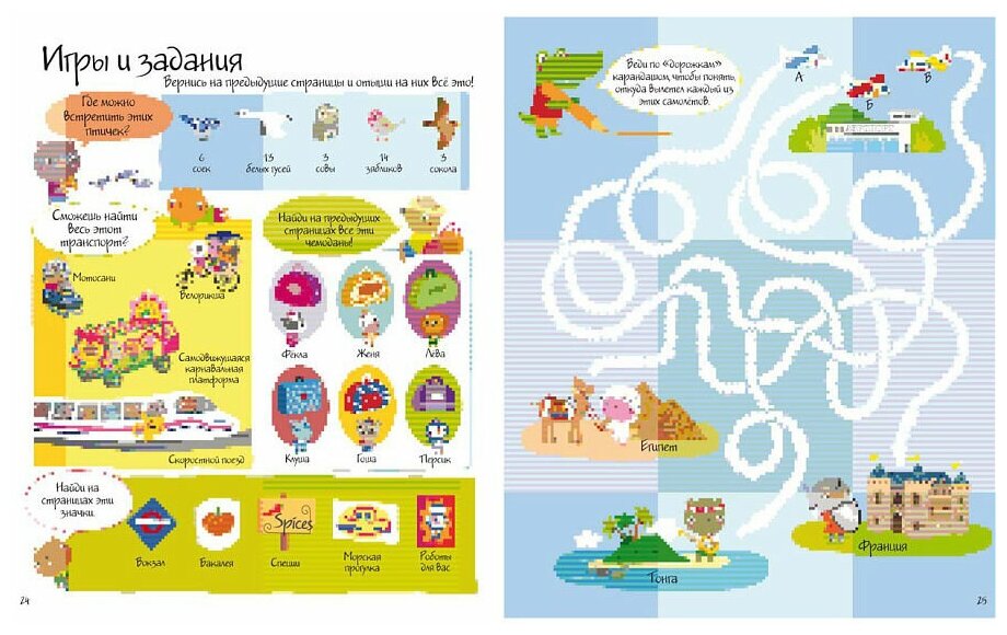 Книга из серии "Найди-покажи-наклей", каждый разворот это посвящен определенной стране или части света. Каждая страничка книги запечатана максимальным количеством графических изображений, так чтобы ребенок развивал свою внимательность, выполняя задания, считая и обводя нужные предметы. В книге также есть раскраски, лабиринты, игры на логику. И самое главное 280 многоразовых наклеек.