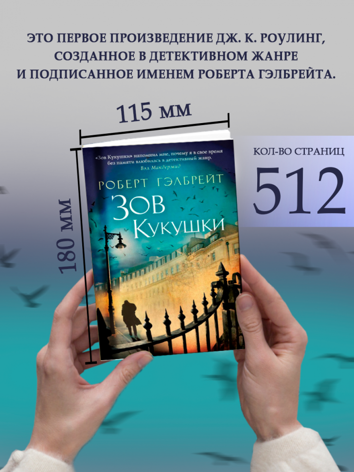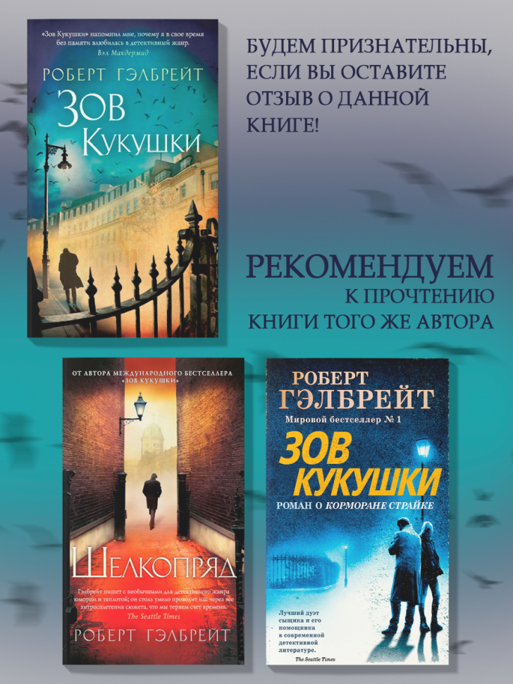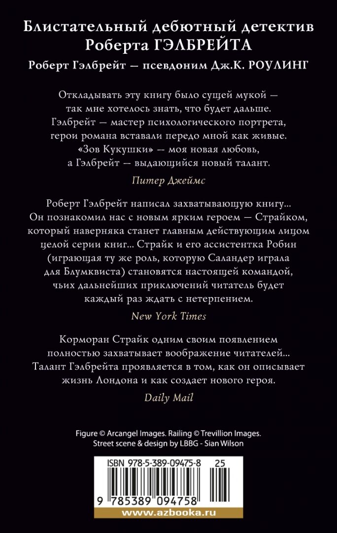 Захватывающий, отточенный сюжет разворачивается на фоне Лондона, от тихих улиц благопристойного Мэйфера до обшарпанных пабов Ист-Энда и круглосуточно бурлящего Сохо. "Зов Кукушки" - незаурядный и заслуженно популярный роман, в котором впервые появляется Корморан Страйк. Это также первое произведение Дж. К. Роулинг, созданное в детективном жанре и подписанное именем Роберта Гэлбрейта.