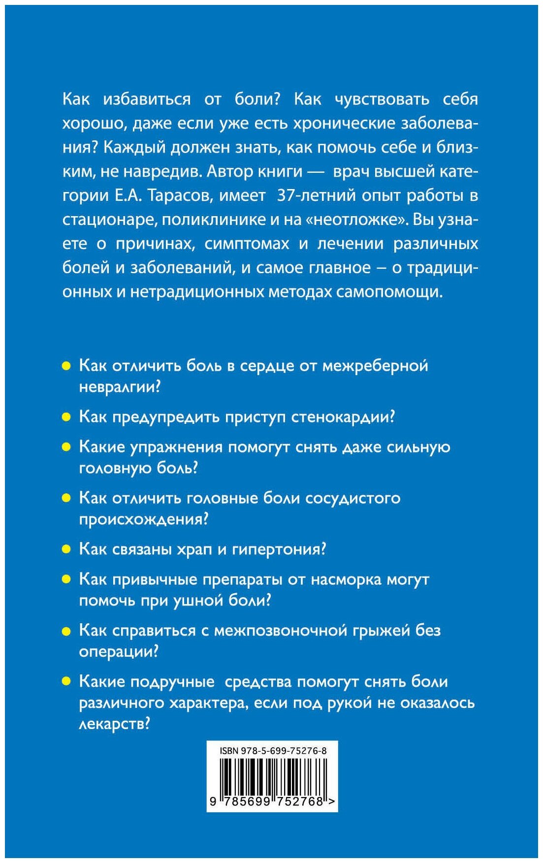 Как избавиться от боли? Как чувствовать себя хорошо, даже если уже есть хронические заболевания? Какие подручные средства помогут снять боли различного характера, если под рукой не оказалось лекарств? Каждый должен знать, как помочь себе и близким, не навредив. Автор книги, врач высшей категории Е.А. Тарасов, имеет 37-летний опыт работы в стационаре, поликлинике и на «неотложке». Вы узнаете о причинах, симптомах и лечении различных болей и заболеваний, и самое главное — о традиционных и нетрадиционных методах самопомощи.
