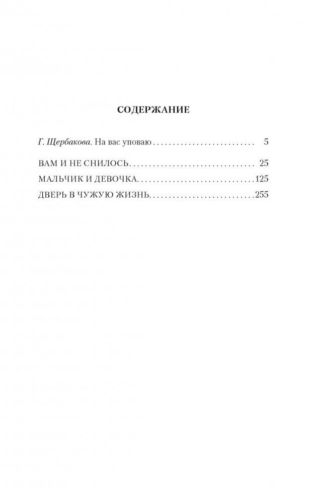 Всероссийскую славу Галине Щербаковой (1932 - 2010) принесла повесть "Вам и не снилось", признанный бестселлер восьмидесятых, за которым последовало множество прекрасных книг о любви - ведь, по мнению автора, только любовь придает смысл этой жизни. А еще о дружбе и предательстве, о сложных переплетениях судьбы, о людях, которые не сдаются и продолжает искать свое счастье, несмотря на все преграды и испытания. Помимо знаменитой "Вам и не снилось" в настоящий сборник вошли также повести "Мальчик и девочка" и "Дверь в другую жизнь" - трогательные, мудрые и удивительно современные.
