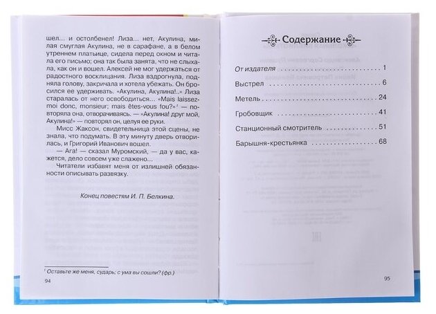 Сборник «Повести Белкина», состоящий из 5 повестей, является первым завершённым прозаическим произведением А. С. Пушкина, написанным им от лица вымышленного персонажа. Повести написаны в различных существующих к тому времени направлениях в русской литературе: «Выстрел» — реализм; «Метель», «Станционный смотритель» —сентиментализм; «Барышня-крестьянка» — водевиль, «Гробовщик» — с элементами готической повести.Произведения сборника включены в школьную программу и адресованы ребятам среднего школьного возраста.Тексты произведений представлены без сокращений, напечатаны на хорошей бумаге крупным шрифтом и содержат цветные иллюстрации О. Ким. Такая книга — отличный подарок и ценное дополнение домашней или школьной библиотеки.