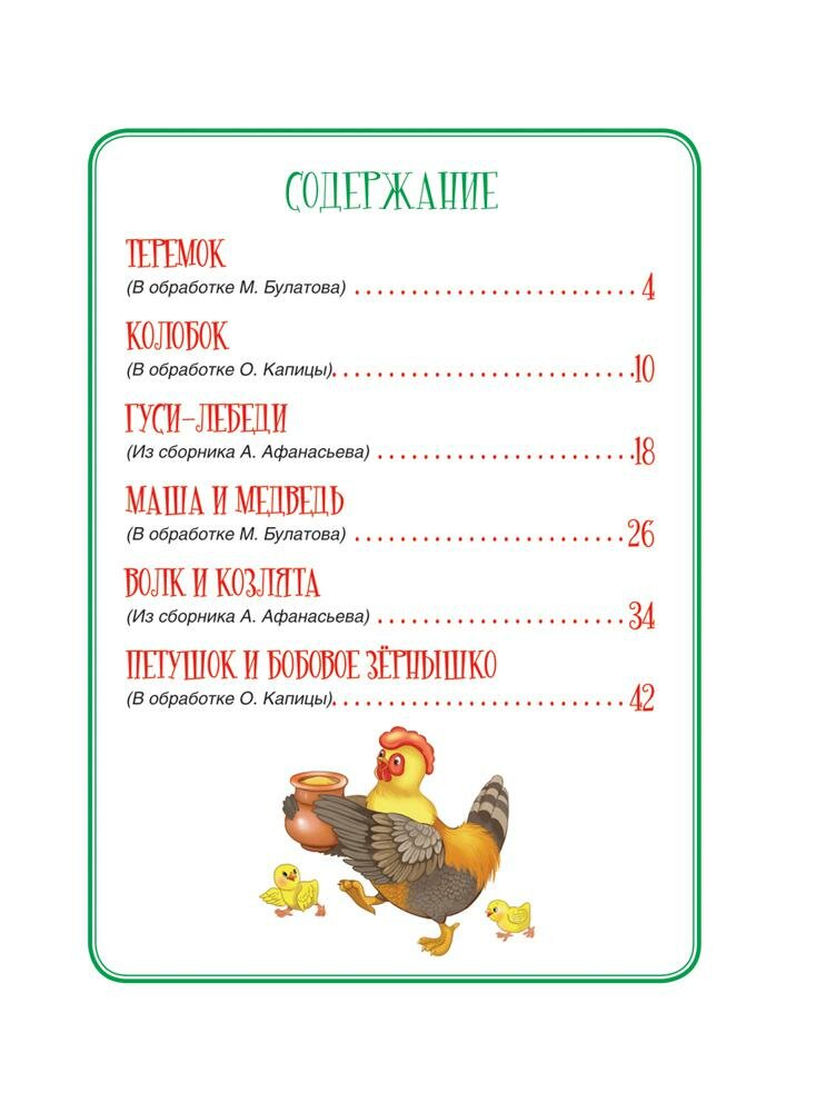 В книгу вошли популярные русские народные сказки: "Теремок", "Колобок", "Гуси-лебеди", "Маша и медведь", "Волк и козлята", "Петушок и бобовое зернышко". Традиционные пересказы М. Булатова, О. Капицы, А. Афанасьева. Иллюстрации Е. Здорновой.