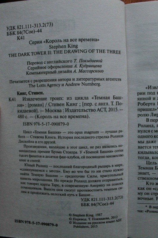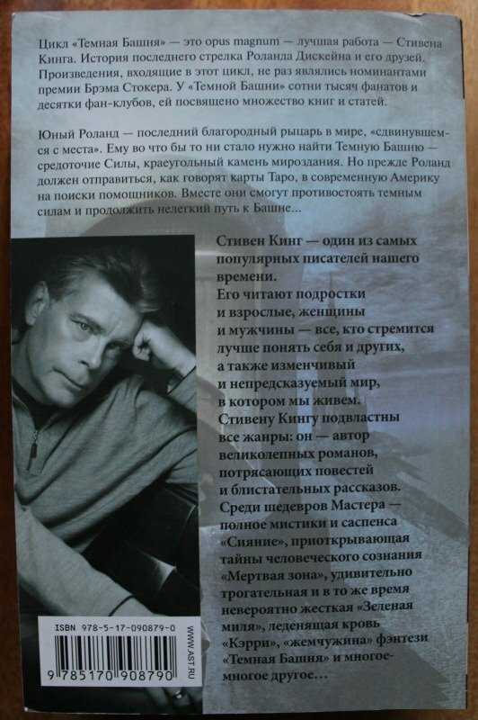 Да, кстати, никто не знает - а почему на задней странице данного издания (кстати, как и здесь, на странице Лабиринта, в аннотационной сноске про книгу) про приключения старенького и уставшего последнего Стрел'ка Срединного мира пишут, что "юный Роланд ... должен отправиться в современную Америку на поиски "?
