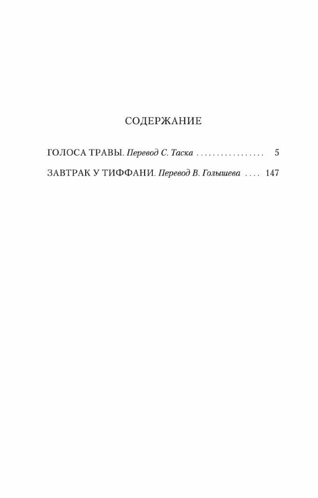 Трумен Капоте, автор таких бестселлеров, как "Хладнокровное убийство", "Летний круиз", "Другие голоса, другие комнаты" и "Луговая арфа", входит в число крупнейших американских прозаиков ХХ века. Вниманию читателя предлагаются две его классические повести: лирические «Голоса травы», публикующиеся в новом переводе, а также «Завтрак у Тиффани» — самое знаменитое произведение Капоте, прославленное в 1961 году экранизацией с Одри Хепберн в главной роли, сыгравшей главную героиню повести Холли Голайтли, одну из самых ярких и необычных женщин американской литературы. Эксцентричную, полную жизни Холли влечет к себе мир богатых людей, сверкающий яркими огнями бриллиантовых колье. Руководствуясь в своих поступках лишь голосом сердца, сочетая детскую наивность с чарующим обаянием настоящей женщины, она воплощает в себе саму сущность Нью-Йорка — города, в котором мечты лежат на расстоянии вытянутой руки, отгороженные блестящими стеклами пленяющих взгляды витрин.