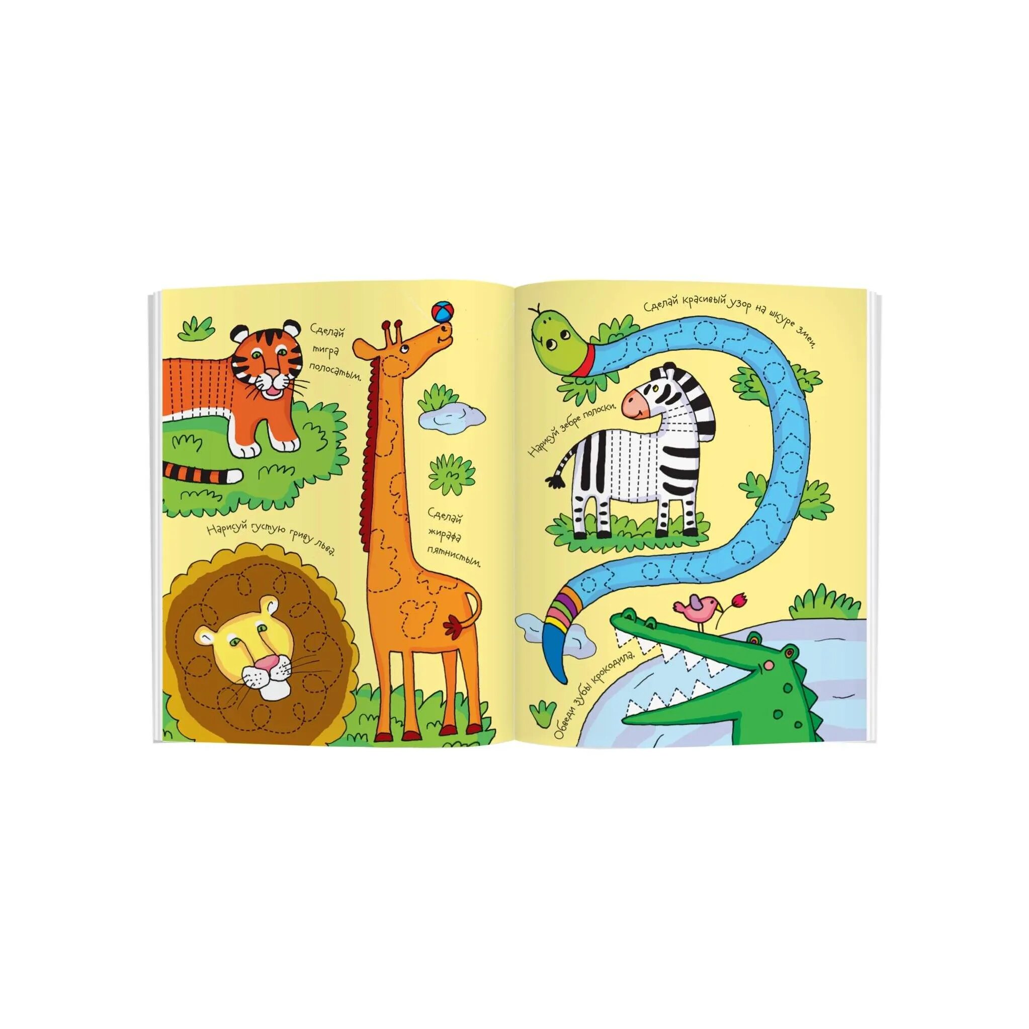 Очень понравилась трёхлетней внучке, любящей животных, которых в книжке много. С удовольствием выполняет задания, причём подходя творчески, в зависимости от настроения - пузырьки воздуха у рыб или пятна у жирафа может раскрасить, а может обвести,любит рисовать полосы у тигра. Задания вполне доступны для детей с 3 лет.