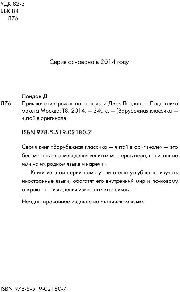 Серия книг «Зарубежная классика — читай в оригинале» — это бессмертные произведения великих мастеров пера, написанные ими на их родном языке и наречии. Книги из этой серии помогут читателю углубленно изучать иностранные языки, обогатят его внутренний мир и по-новому откроют произведения известных классиков. Роман Джека Лондона «Приключение» на английском языке, неадаптированное издание.