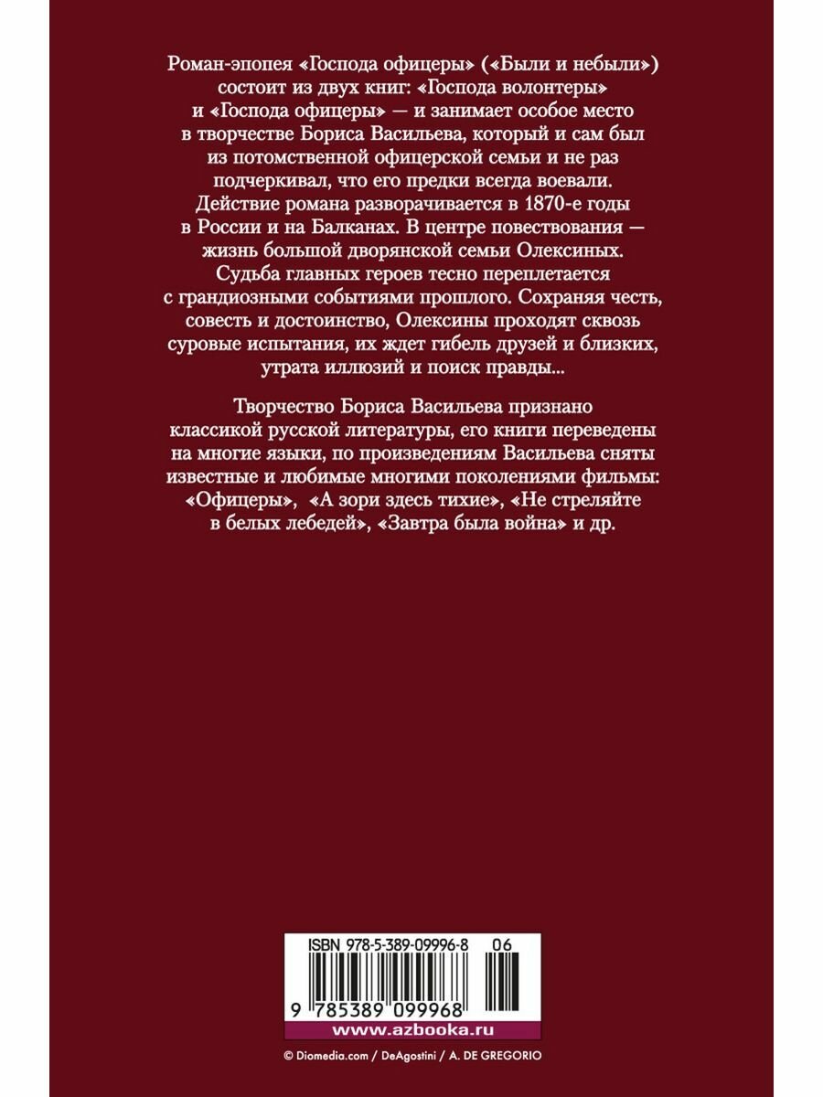 Роман-эпопея "Господа офицеры" ("Были и небыли") занимает особое место в творчестве Бориса Васильева, который и сам был из потомственной офицерской семьи и не раз подчеркивал, что его предки всегда воевали. Действие романа разворачивается в 1870-е годы в России и на Балканах. В центре повествования - жизнь большой дворянской семьи Олексиных. Судьба главных героев тесно переплетается с грандиозными событиями прошлого. Сохраняя честь, совесть и достоинство, Олексины проходят сквозь суровые испытания, их ждет гибель друзей и близких, утрата иллюзий и поиск правды. Творчество Бориса Васильева признано классикой русской литературы, его книги переведены на многие языки, по произведениям Васильева сняты известные и любимые многими поколениями фильмы: "Офицеры", "А зори здесь тихие", "Не стреляйте в белых лебедей", "Завтра была война" и др.