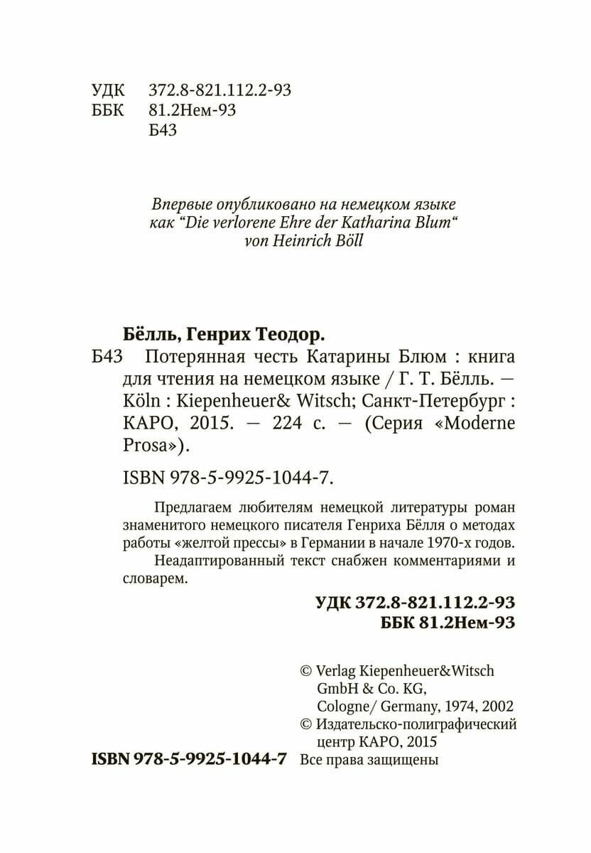 Die verlorene ehre der Katharina blum / Потерянная честь Катарины Блюм. Книга для чтения на немецком языке (Генрих Белль); КАРО, 2018