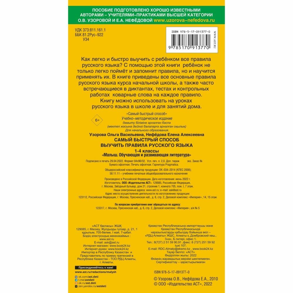 Самый быстрый способ выучить правила русского языка. 1-4 классы (Узорова Ольга Васильевна, Нефёдова Елена Алексеевна (соавтор), Нефёдова Елена Алексеевна); АСТ, 2021