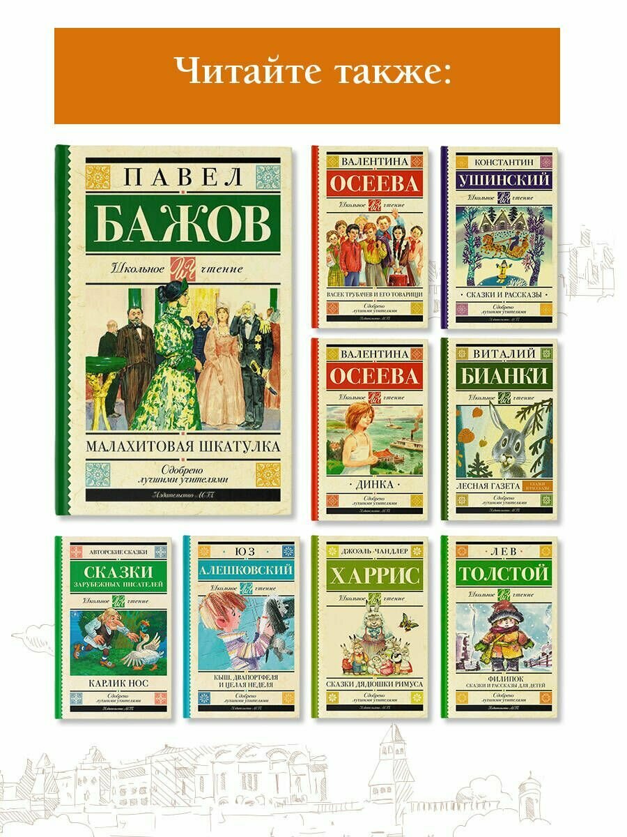 Вспомни или спроси у родителей, что за фонтаны стоят на ВДНХ. Один из них носит красивое, необычное название - "Каменный цветок". И это неспроста, ведь художник-архитектор создавал его по образам, навеянным уральскими сказами П.П. Бажова, с которыми мы предлагаем познакомиться и тебе. На страницах "Малахитовой шкатулки" ты встретишь строгую, но справедливую Хозяйку Медной горы, Данилу-мастера, вечно молодую Синюшку, Огневушку-поскакушку, горного козлика Серебряное копытце… Дивный уральский край раскроет перед тобой свою сокровищницу - красоту природы, мастерство горных умельцев, их особый язык и древние предания.
