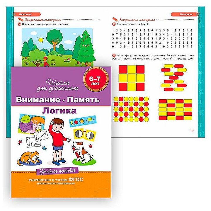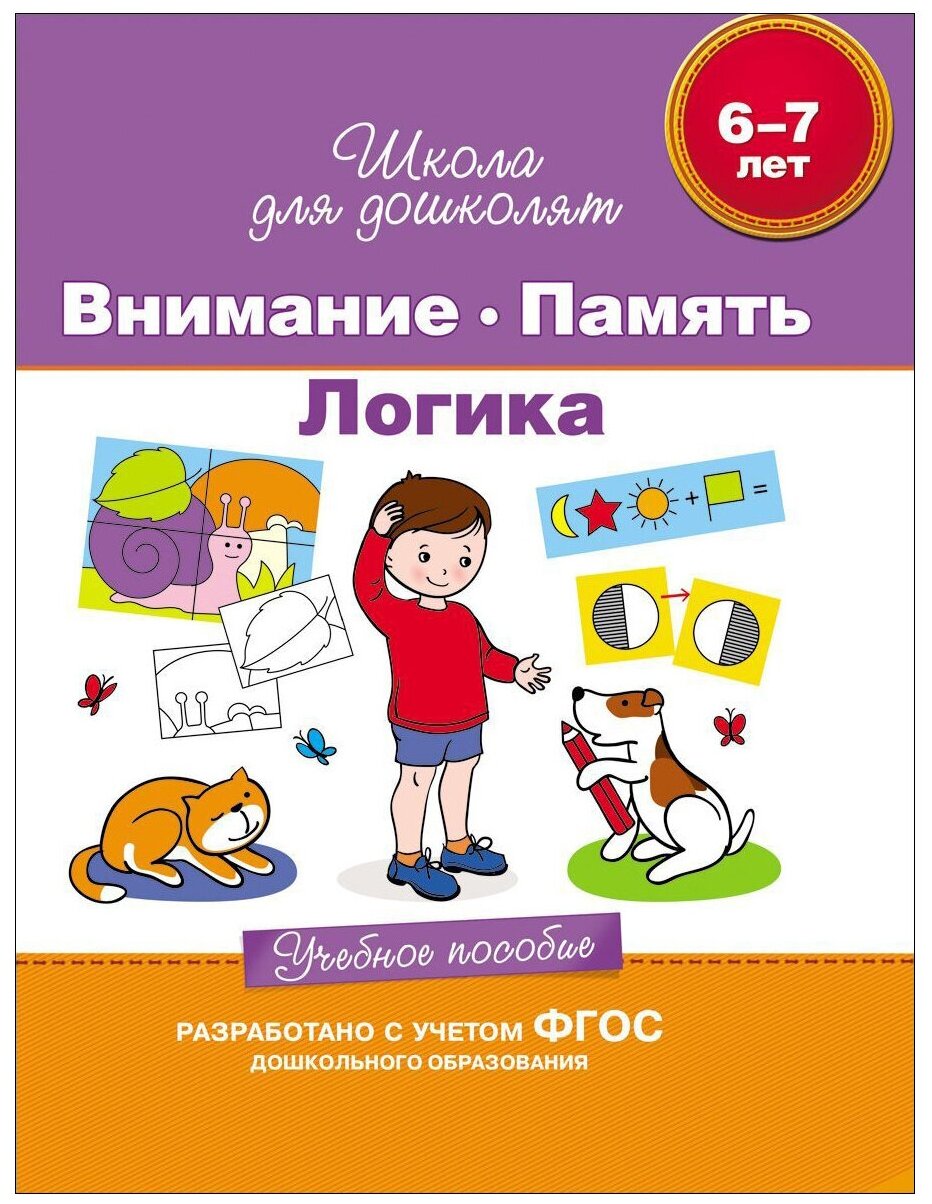 Учебное пособие Внимание Память Логика из серии Школа для дошколят интересная и занимательна. Ребенок увлеченно выполняет задания, все иллюстрации красочные и приятны для восприятия, шрифт крупный. Пособие предназначено для детей старшего дошкольного возраста, учебное пособие поможет подготовить ребенка при поступлении в школу. Книга разбита на три часть - это внимание (ребенок учится сравнивать, находить отличия, выполнение последовательности цепочки), память (работа с текстами, отвечать на вопросы по прочтенному тексту, повторение предложений), логика (дорисовать, расставить последовательность всей действий). По окончанию каждого задания для закрепления в виде упражнения.