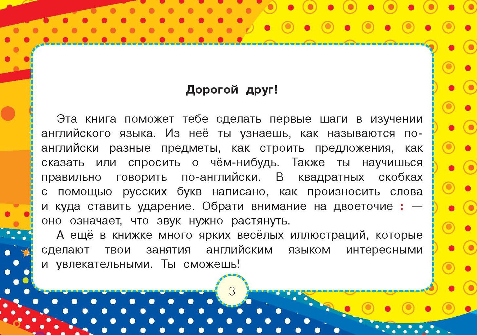 Данное пособие поможет вашему ребенку сделать первые шаги в изучении английского языка. В нем даются основные слова, с которых начинают обучение, простые фразы, вопросы и ответы о семье и окружающих предметах, а также элементарные правила английского языка в доступной для ребенка форме. А яркие веселые картинки сделают обучение увлекательным.