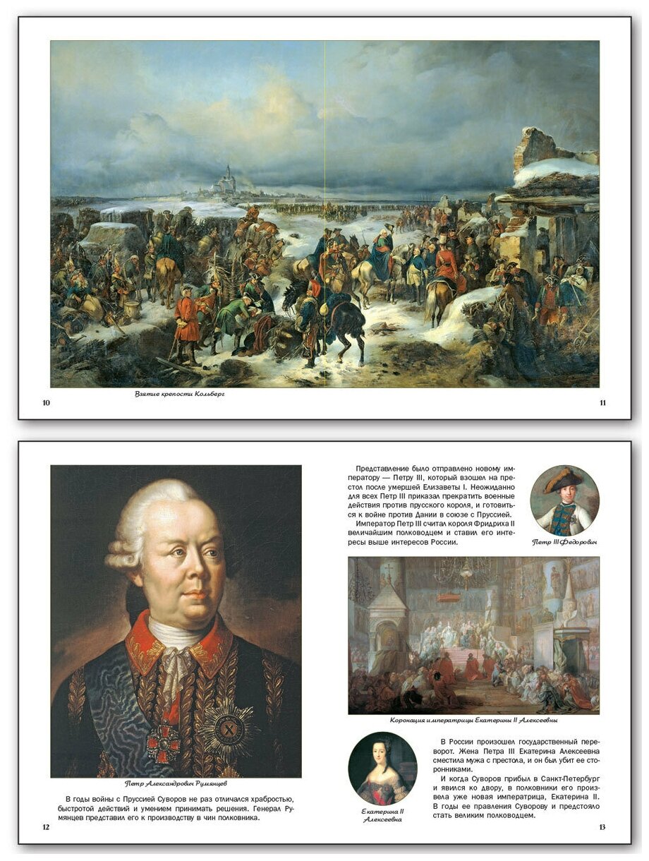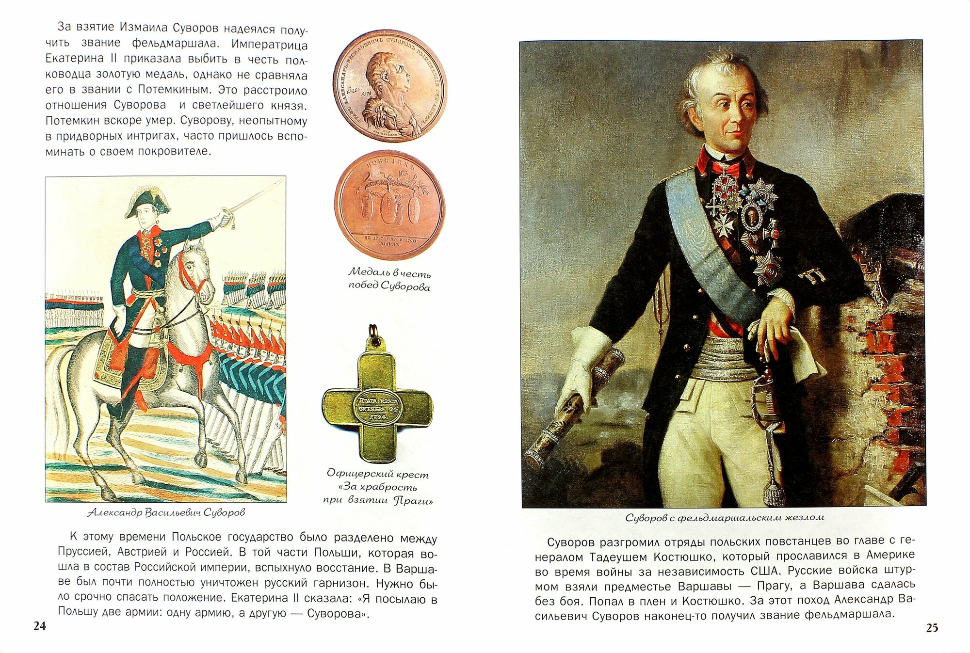 Купила эту книгу в другом магазине. Отличаются обложкой и издательством. Но описание и внутреннее наполнение одинаковое. В книге достаточно много иллюстраций (список прилагается). Шрифт крупнее, чем в литературе для взрослых. Рассказ о Суворове начинается с повествования о предках полководца. Мальчишки мои читают с удовольствием данную книгу. Иногда сложно ребёнку запомнить все исторические события. С помощью книг данной серии материал лучше запоминается. На "канве" жизни Суворова описаны основные исторические события его эпохи, наверное, именно такая подача способствует лучшему запоминанию материала. В конце книги есть хронология.