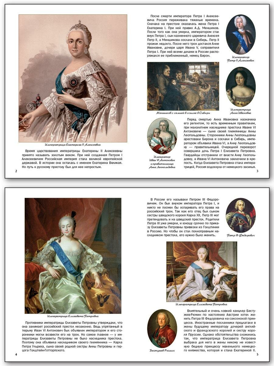Текст мне не очень-то понравился. Довольно сухо, сумбурно, нагромождение имен, галопом по европам - обо всем сразу и ни о чем как следует. Не увидела я стройности изложения, когда в голове события и персоналии по полочкам будут укладываться, тяжеловато было внимание удерживать. Кстати... Думаете, что ребенок из этой книги (вроде бы как название обязывает) уяснит, как происходило присоединение Крыма? Не уяснит. Тут и взрослый не уяснит)) Есть пара абзацев про войны с Турцией, вот между этими войнами и упоминается про Крым, "который Потемкин присоединил к России". Зато моменту приезда Фике в Россию предшествовало аж 12 страниц с упоминанием даже количества носовых платков и платьев бедной принцессы))