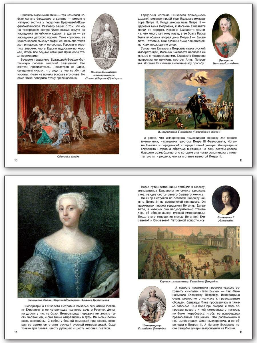 Конечно, какое-то представление о личности Екатерины книга даст, но на какой возраст это будет одновременно и понятно, и интересно, и полезно - вот прям не знаю, что и сказать… В целом издание выглядит как попытка на несколько листов впихнуть невпихиваемое. Невольно вспоминаются книжки из серии «Настя и Никита», вот там всё понятней - и на какой возраст, и тексты более логичные.