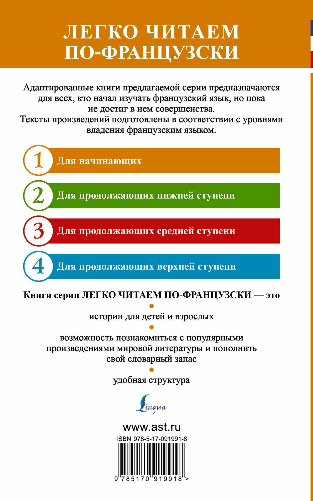 Еще будучи студенткой я учила французский. Но спустя годы я очень многое позабыла. Увидев данную серию книг не могла пройти мимо. Заказала себе первую ступень (ожидала, что я совсем 0 ). Каково же было мое удивление, когда я с легкостью ее прочла от корки до корки! Текст четкий, бумага плотная, шрифт удобный для чтения. В конце каждой сказки дается краткий словарик и несколько заданий на внимательность к тексту. Это тоже помогает восполнить словарный запас. Теперь буду заказывать остальные ступени! Я очень довольна этой серией книг.