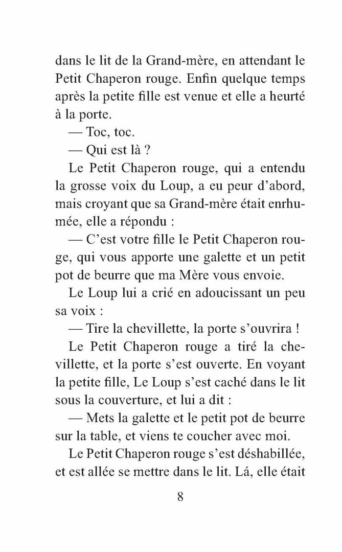 Книга появилась в поиске по слову - Билингво. И честно говоря была разочарована тем что в ней не идет параллельно перевод на русский. Но т.к. покупала не для себя, а для мамы знающей язык. То не стала возвращать. Тонкая книга, бумага простая, но шрифт крупный и четкий. В конце есть упражнения на 5 заданий и словарик фр.слов. Как человек не знающий фр.языка о качестве текста сказать ничего не могу.