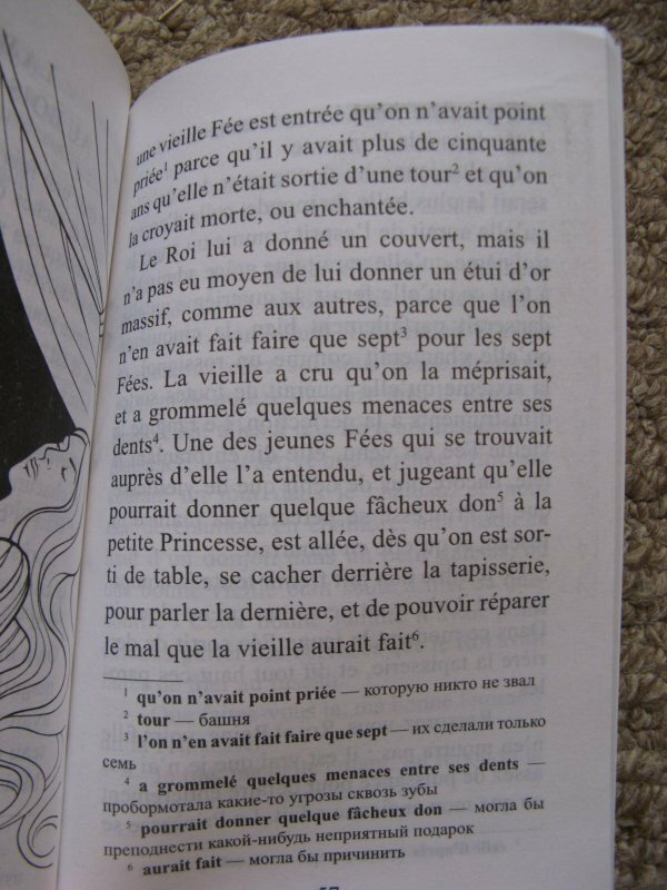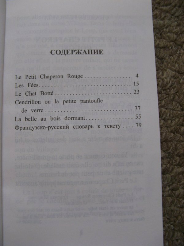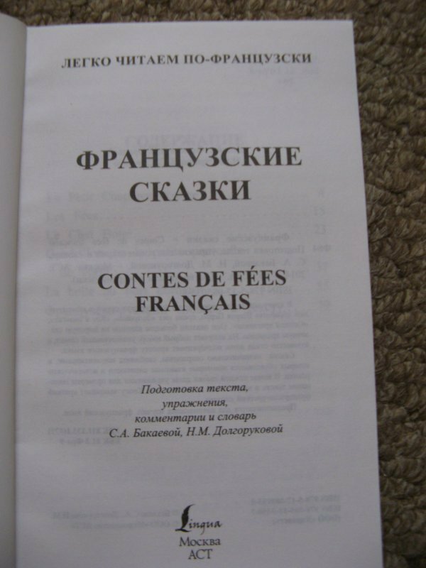 Изучаю французский меньше года. Покупала книжку для домашнего чтения и не пожалела! Для начинающих, то есть уровень А1, самое то. Предложения построены легко, слова общеупотребительные и потом много где встречались. Сложные вводные конструкции и устойчивые выражения переведены в сносках. В конце каждой сказки есть упражнения на отработку слов и понимания текста. + В конце есть словарик. Всего 5 сказок: Красная Шапочка, Подарки феи, Кот в сапогах, Золушка и Спящая красавица.