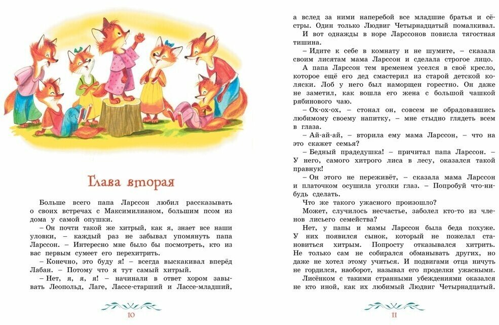Какое прилагательное приходит вам первое в голову, когда вы хотите сказать о лисе из сказки? Конечно хитрый! И семья хитрых Ларссонов не исключение из правил. Огромное семейство состоит из родителей и тринадцати хитрых, радующих маму и папу детей (хитрецов и пройдох), а также .... четырнадцатого лисенка Людвига. И тут мы сталкиваемся с героем, который не вписывается в наше представление о том, что каждый лис должен с удовольствием хитрить и плутовать.... Великолепная сказка о великой силе дружбы, честности и не наигранной храбрости. Ребенку будет о чем поразмыслить и обсудить с мамой. Великолепные иллюстрации выше всех похвал, в них заложено столько тепла и ребенок с удовольствием будет рассматривать их во время прочтения, что поможет ему передохнуть, если читает сам, или не заскучать, если читает мама.