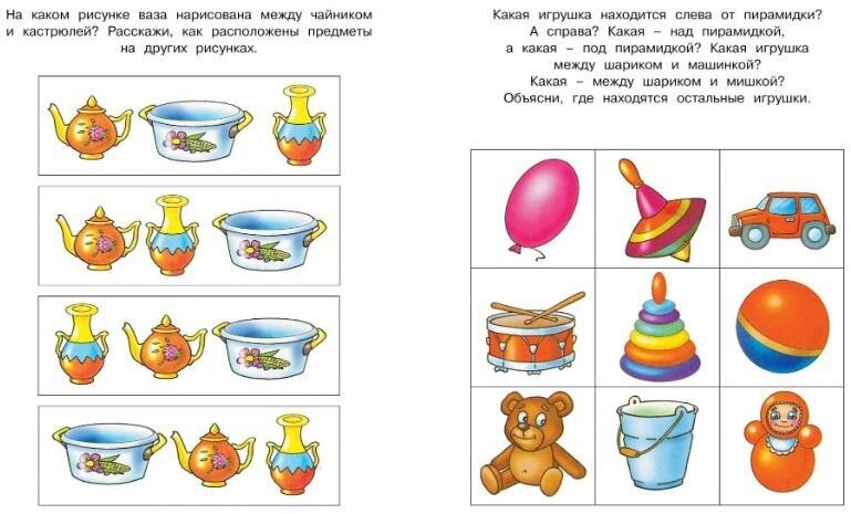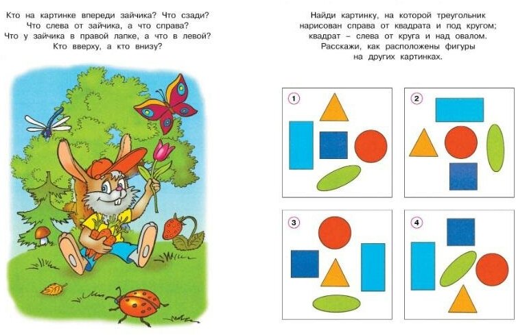 Неплохое пособие для занятий с ребенком. Хорошо разъяснения понятия вверх-вниз, задания на понимание положения предмета, использования предлогов( в, на, между). Задания про вправе-влево не очень понравились- на мой взгляд трудно объяснить по картинке. Есть несколько заданий на счет, понятия далеко-близко.