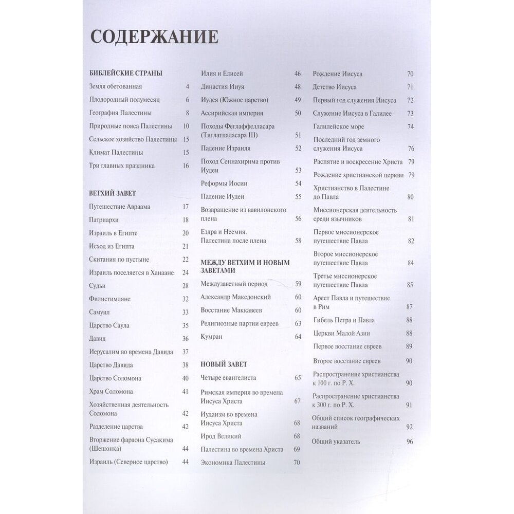 Очень хороший атлас. Можно проследить по карте весь путь израильтян, по которому их водил Господь, наглядно. И кратко изложен, можно сказать, Ветхий Завет, и основные события Нового Завета. У меня лично было довольно размытое представление о ветхозаветных событиях, а после прочтения этого атласа стало понятнее. В Новом Завете послания апостола Павла изложены не в хронологическом порядке,а здесь можно проследить хронологию его путешествий, и т.д. Очень интересно. Интересные иллюстрации :макет скинии,реконструкция храма Соломона и многое другое. Кроме того, отличного качества бумага, и красочное оформление, что тоже играет свою роль.
