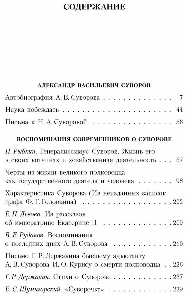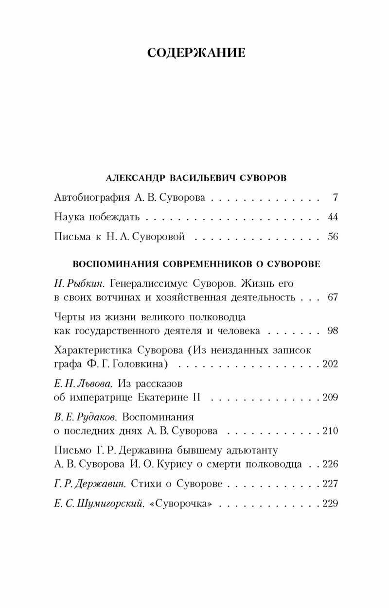В настоящем издании наряду с выдающимся произведением военной мысли "Наукой побеждать" представлены автобиография Суворова и его письма к дочери, Суворочке, в которых полководец открывается как любящий и заботливый отец. Дополнят образ "солдата-фельдмаршала" и чудака, каковым Суворова признавали многие, воспоминания о нем современников.