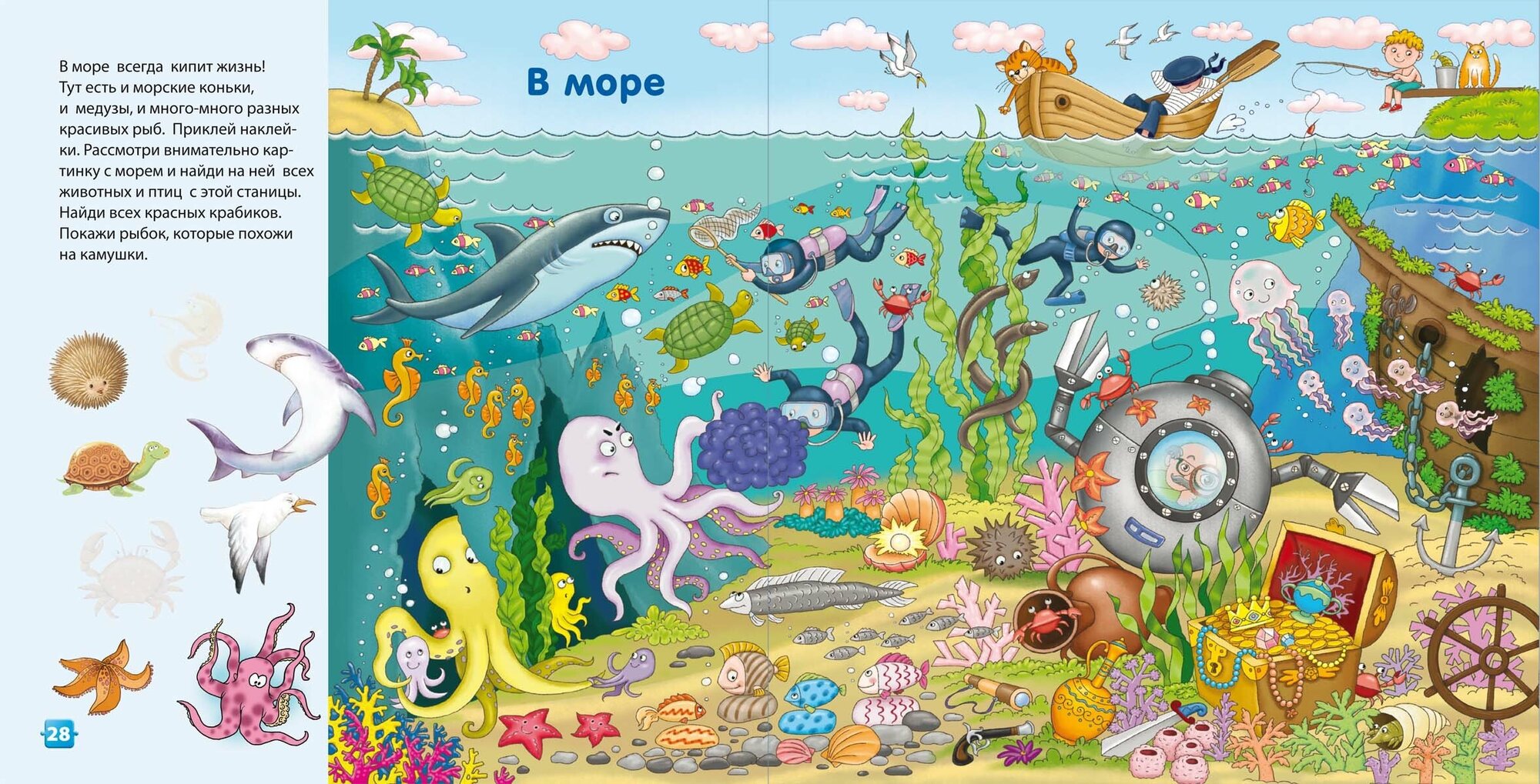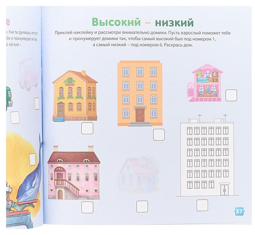 Очень интересная и познавательная книга в мягкой обложке. В книге представлены картинки, разделенные на категории-игрушки, мебель, посуда, одежда, обувь, животные, и т.д. На каждой странице нужно наклеить недостающий предмет. Наклейки находятся в конце книги-большие и красочные, малышу будет легко их наклеивать. Так же есть возможность раскрашивать некоторые предметы.