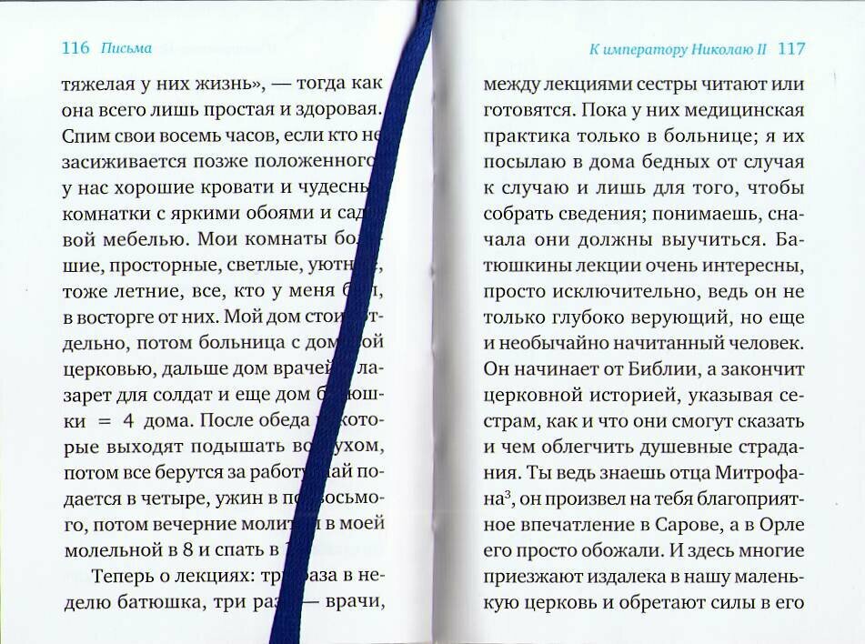 Книга представляет собой карманное издание - размер дамской записной книжки, но при этом книга выполнена очень качественно, имеется закладка, что очень удобно. Содержание весьма интересное и включает в себя письма Елизаветы Федоровны своим близким родственникам у друзьям, читая которые погружаешься в то время, улавливая настроение, мысли и переживания. Читается на одном дыхании, рекомендую.