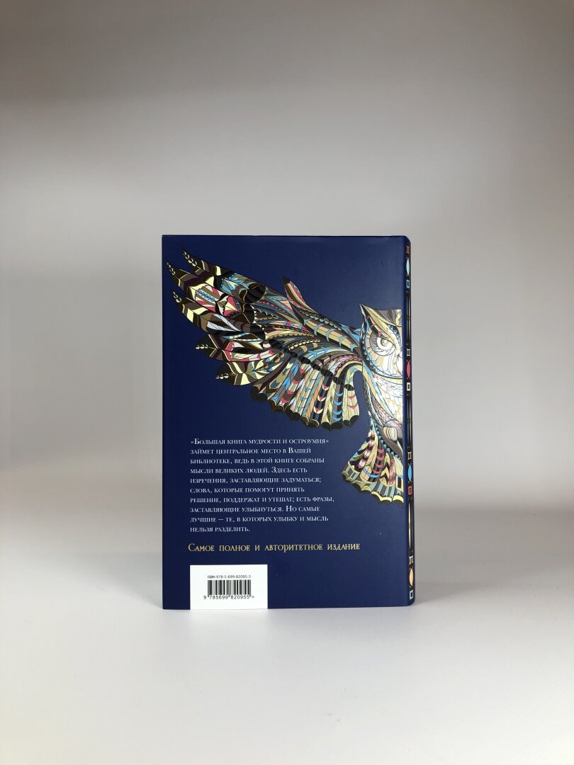 Мой папа очень любит сборник афоризмов, купленный им ещё в нулевых, регулярно цитирует его в разговорах, выписывает особо понравившиеся, открывает на заложенных страницах. Решил подарить ему томик поновее и побольше. Долго выбирал и в итоге остановился именно на этом. Подкупило оформление - очень уж сова красивая на обложке. А живьём она ещё и блестит! Уже после покупки порадовало обилие тем - есть и вечные, типа любви и верности, и относительно современные, например, Голливуд. Папа остался очень доволен.
