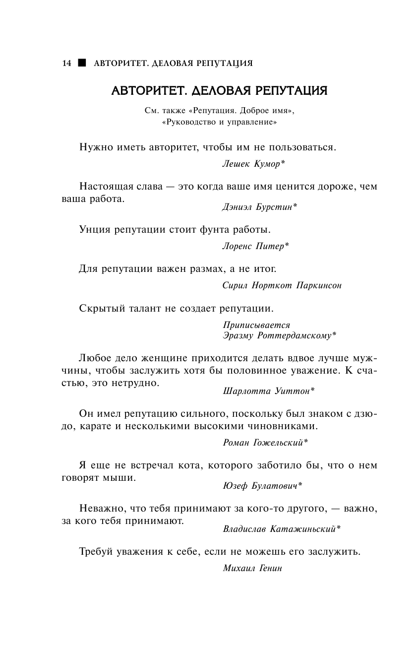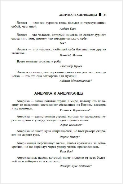 Искал книгу в подарок тёте, любительнице всяческих каламбуров и приговорок. Так как она сама может написать подобный сборник в два присеста, издание было нужно солидное, чтобы было много того, чего она раньше не слышала и не читала. В итоге выбрал это и не пожалел. Во-первых, книга прекрасно оформлена и солидно смотрится на полке. Во-вторых, цитат на все возможные темы там видимо-невидимо. Причём подобраны все с умом, не мусолят одну и ту же мысль, переливая из пустого в порожнее, как в других подборках, а дополняют друг друга. Иной раз кажется, будто мыслители прошлого прямо-таки вступают в дистанционную полемику друг с другом. В общем, тётя довольна.