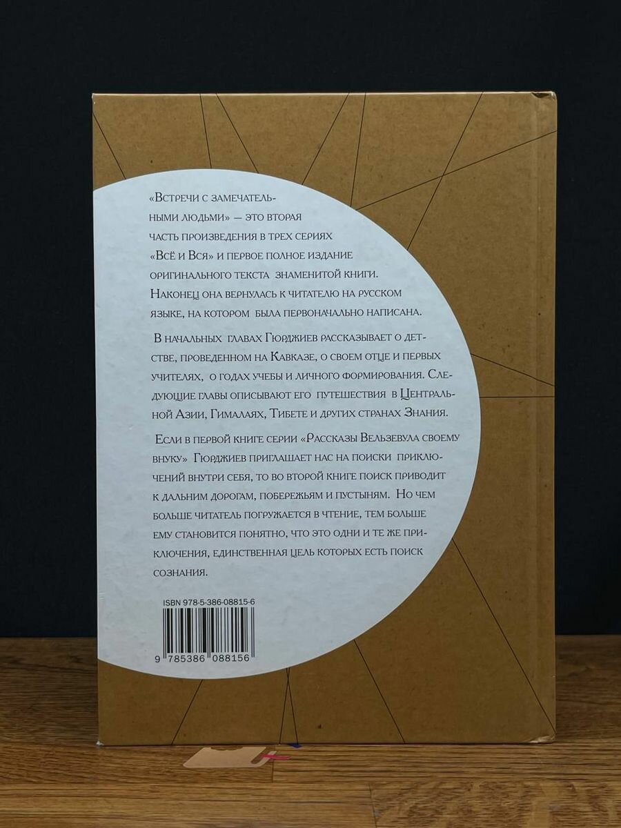 Данное издание впервые берет за основу оригинальную версию текста. Это подразумевает, что все предыдущие издания на русском языке были, к сожалению, неправомерными переводами с английского или с французского. Эта рукопись является уникальным материалом, который дошел до нас в своей оригинальной форме. Язык Гюрджиева очень самобытен; многие выражения и географические названия в тексте принадлежат эпохе 20х-30х годов ХХ века, когда была написана книга. "Встречи с замечательными людьми" — это вторая часть трилогии "Всё и Вся" и первое полное издание оригинального текста знаменитой книги. Наконец она вернулась к читателю на русском языке, на котором была первоначально написана.