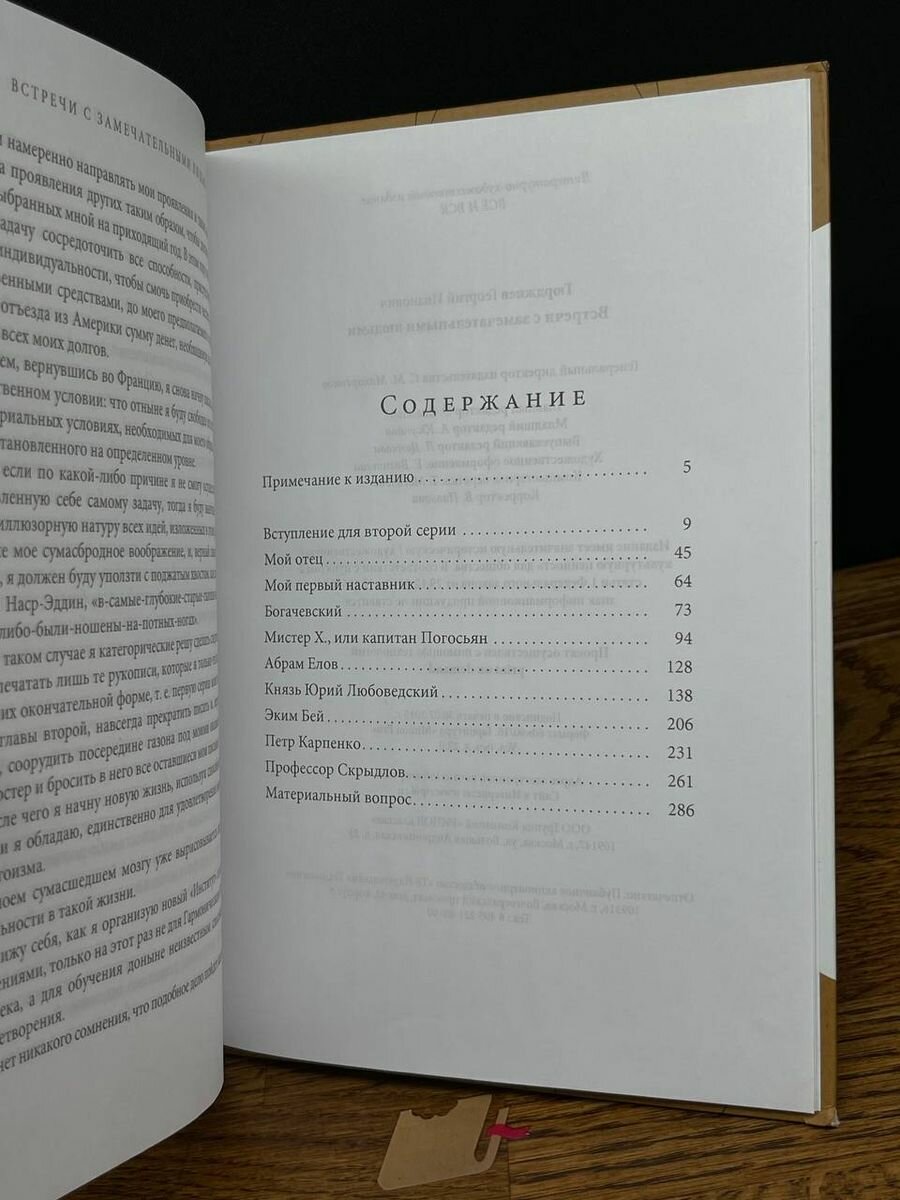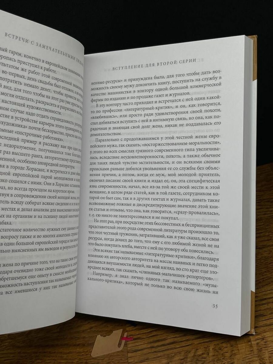Все глубже и глубже погружаясь в завуалированное изложение мыслей Гурджиева, начинаешь с новых позиций смотреть на самые рядовые вещи и ситуации из жизни. Я все больше убеждаюсь в том, что это обусловлено глубочайшей мудростью Георгия Ивановича. именно в книге "Встречи с замечательными людьми" вы познакомитесь с самыми интересными и увлекательными моментами из жизни Гурджиева, узнаете о его поисках истины и глубоких духовных исканиях, почерпнете много глубоко-искренних и мудрых изречений, а самое главное, как в фотоальбоме, перелистнете страницы с описанием интереснейших людей и наставников Г.И.Гурджиева, которые вели его по жизни, жили с ним вместе и шли рядом плечом к плечу в поисках истины. Возможно, манера изложения кому-то покажется сложной, но довольно объемные обороты и красочные зарисовки только еще больше усиливают мистический смысл всей книги и добавляют еще больше ярких, а порой и трагически-темных красок в повествование. Рекомендую всем погрузиться в необыкновенный мир восточной мудрости, который открывается нам в книге Георгия Ивановича Гюрджиева "Встречи с замечательными людьми". -