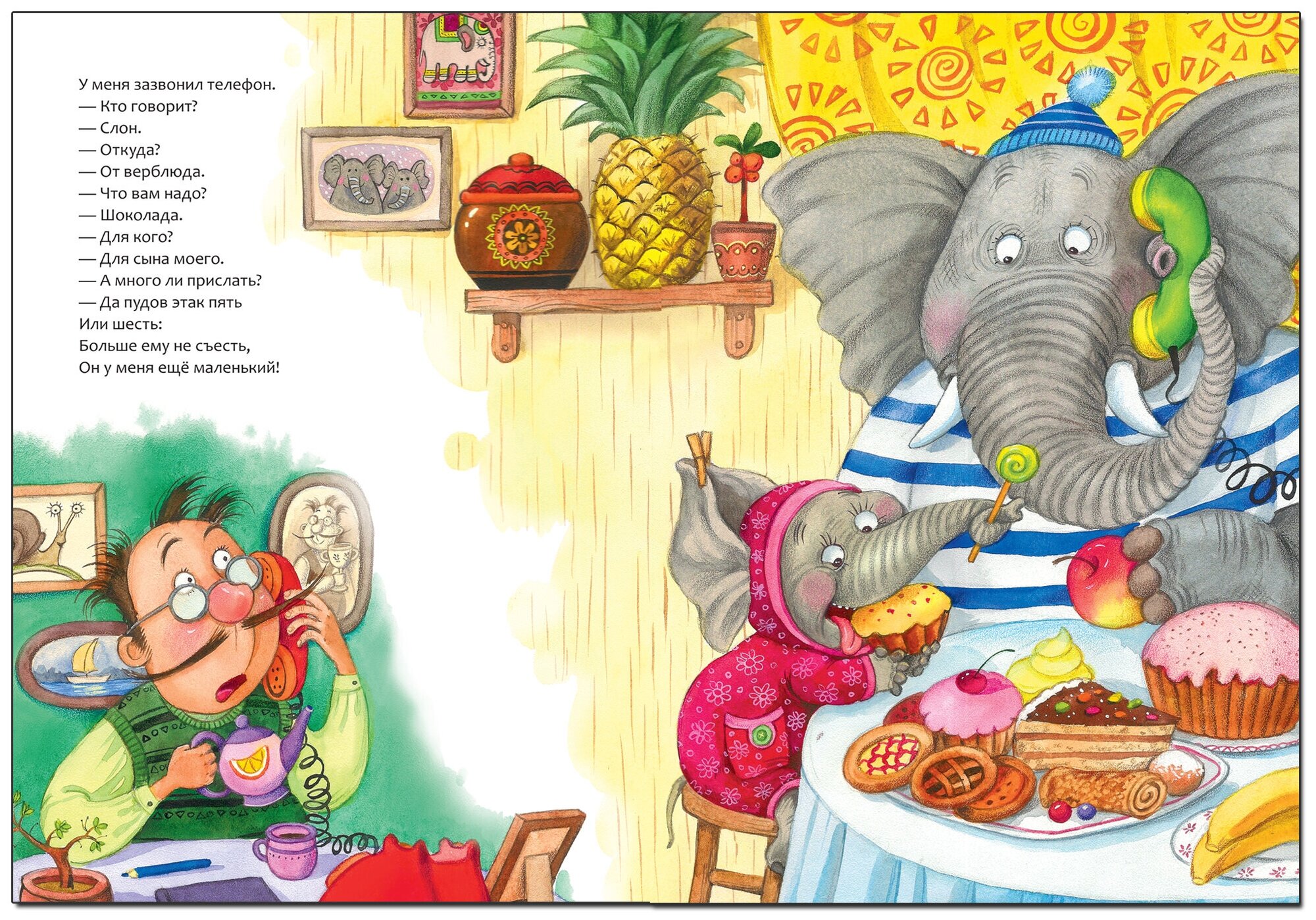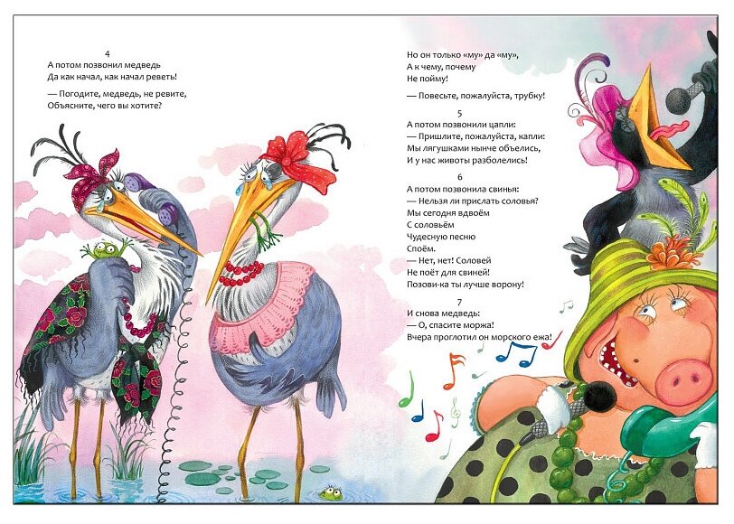 Оформление книжки очень интересное! Иллюстрации яркие, живые и, что самое главное, очень нравятся моемого сыночку. Знакомство с этой серий мы начали с произведения Тараканище и она стала САМОЙ любимой, а сейчас докупили ещё несколько, в том числе Телефон, и эта книга читается с огромным удовольствием только в другом художественном оформлении, т к есть эта книга от другого издательства и с другими иллюстрациями. Как же малышу нравятся эти замечательные картинки, он их разглядывает, всех персонажей показывает. Текст четко совпадает с рисунками, только не хватает иллюстрации на медведя, который всё "му" да "му" ))) Спасибо огромное художнику за такие рисунки! Это класс!