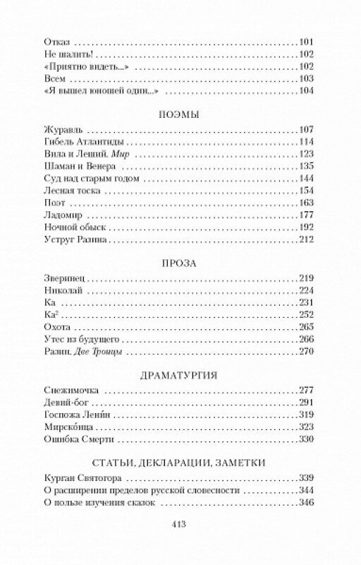 Книга дает представление о творчестве Хлебникова. Действительно, как написано выше, нет сносок, комментариев (кроме авторских, их мало) и прочих дополнительных материалов, чтобы лучше понять автора. (Единственно - везде есть даты, зная отечественную историю, можно представить, в какой обстановке создавалось то или иное.) Но ведь (насколько мне известно) его творчество еще на настолько хорошо изучено литературоведами, чтобы родить что-нибудь похожее на комментарии к Пушкину, Тютчеву или Лермонтову. С другой стороны, очень много отсылок к разным персонажам, мне неизвестным. Постоянно в Википедию нужно залезать. Тем интереснее читать самим и самостоятельно доискиваться до истоков. А для знакомства - очень даже хороший сборник. Только знакомиться нужно медленно, внимательно и вдумчиво: - неимоверное количество новых , придуманных автором, слов, совершенно новых смыслов и ассоциаций, до которых поэзия не добиралась. И его стихи действуют как-то необъяснимо, как будто на животном уровне, что ли. Пробиваются к центру сознания, просто НЛП какое-то иногда. Между прочим, Хлебников - настоящий безумец (в хорошем смысле), полностью повернутый на голову или даже крышу у него снесло. Кажется, ему было глубоко безразлично, что большинство людей может подумать о его Творениях. В общем, истинный гений. Очень ярко, свежо и необычно. И удивительно, что все как-то актуально. (Взять вот, например, о Москве - - Вы помните о городе, обиженном в чуде..." - написано в 1909, а как будто сейчас.) Меня завораживает.