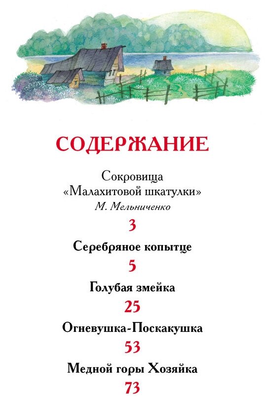 В книгу вошли знаменитые сказы П.П. Бажова: "Серебряное копытце", "Медной горы Хозяйка", "Голубая змейка" и "Огневушка-Поскакушка" В них оживает таинственный мир уральской природы, полный тайн, загадок и неповторимого очарования.